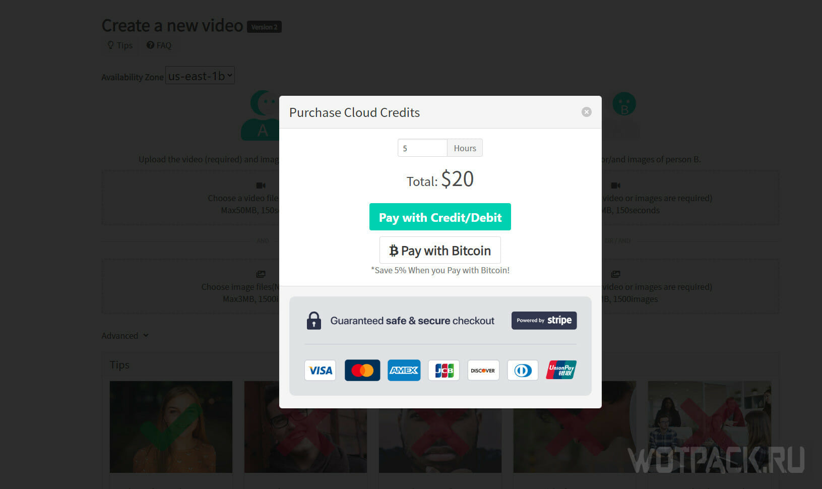 Deepfakes web – еще один способ, как сделать Дипфейк. Особенность данного сервиса заключается в том, что он позволяет создать дип онлайн, без установки различных приложений и программ. Online Deepfake Maker имеет только платную версию. У сервиса действует система почасовой оплаты. На анализ программой исходного материала и саму генерацию дипфейка в среднем уходит около 5 часов. Премиум версия позволит создавать контент за 1 час. Оплачивать можно только иностранными картами.