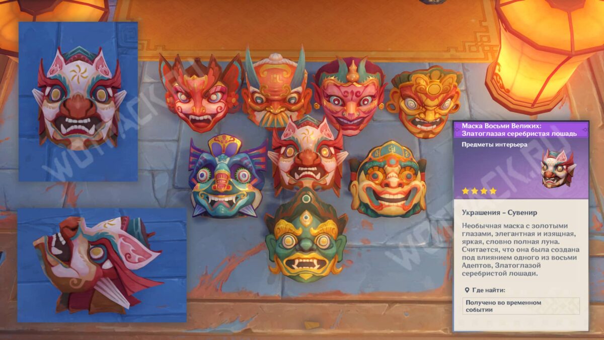 В 2025 году на Празднике морских фонарей выдавали маски Восьми Великих, среди которых есть и украшение, созданное под дочь времени. Возможно, что цветовые гаммы сувенира и героини совпадают.