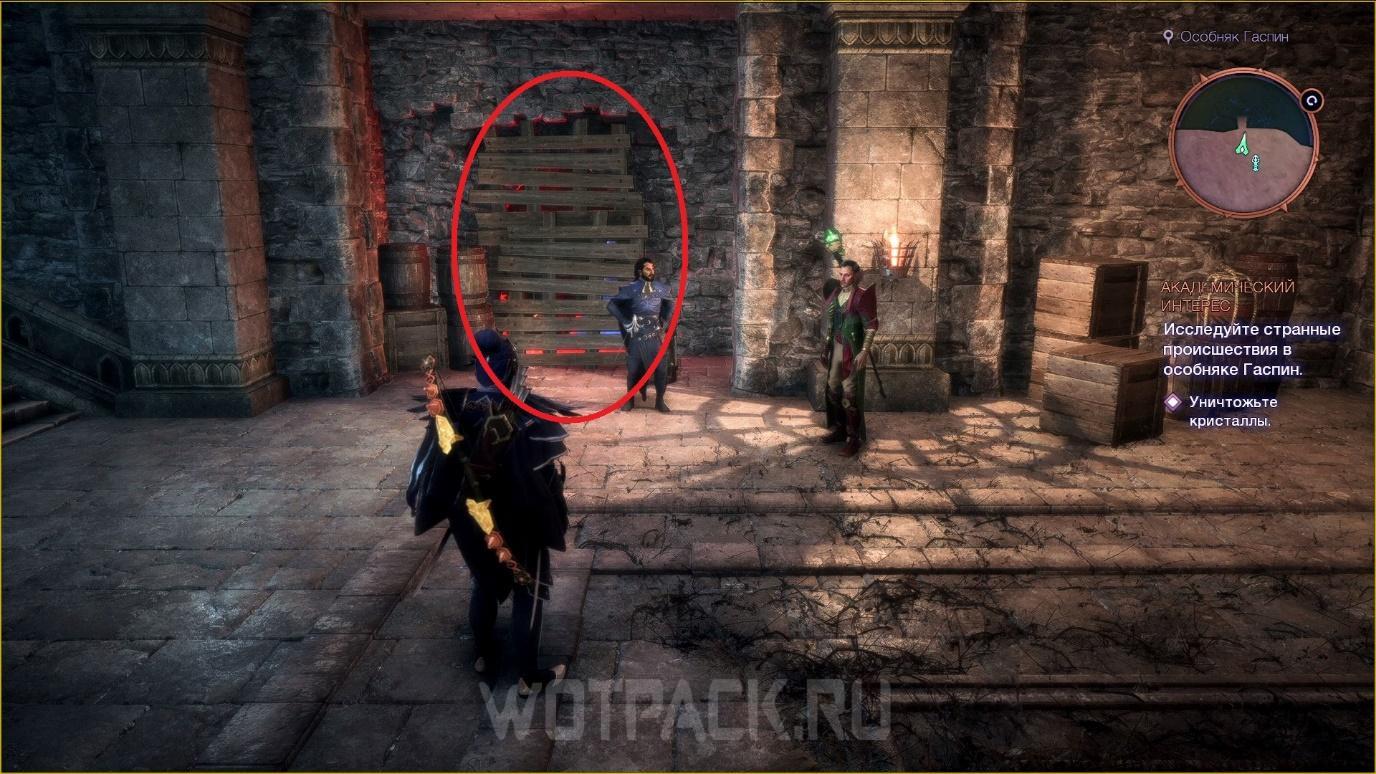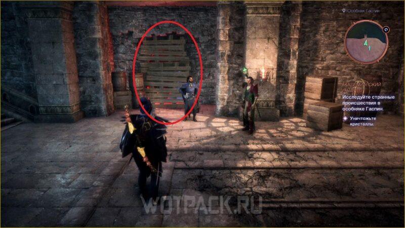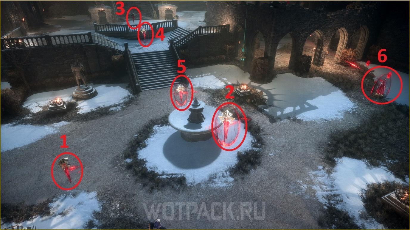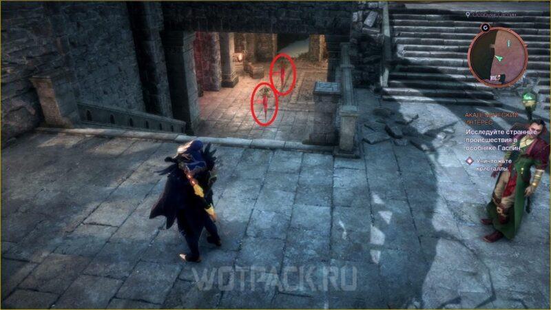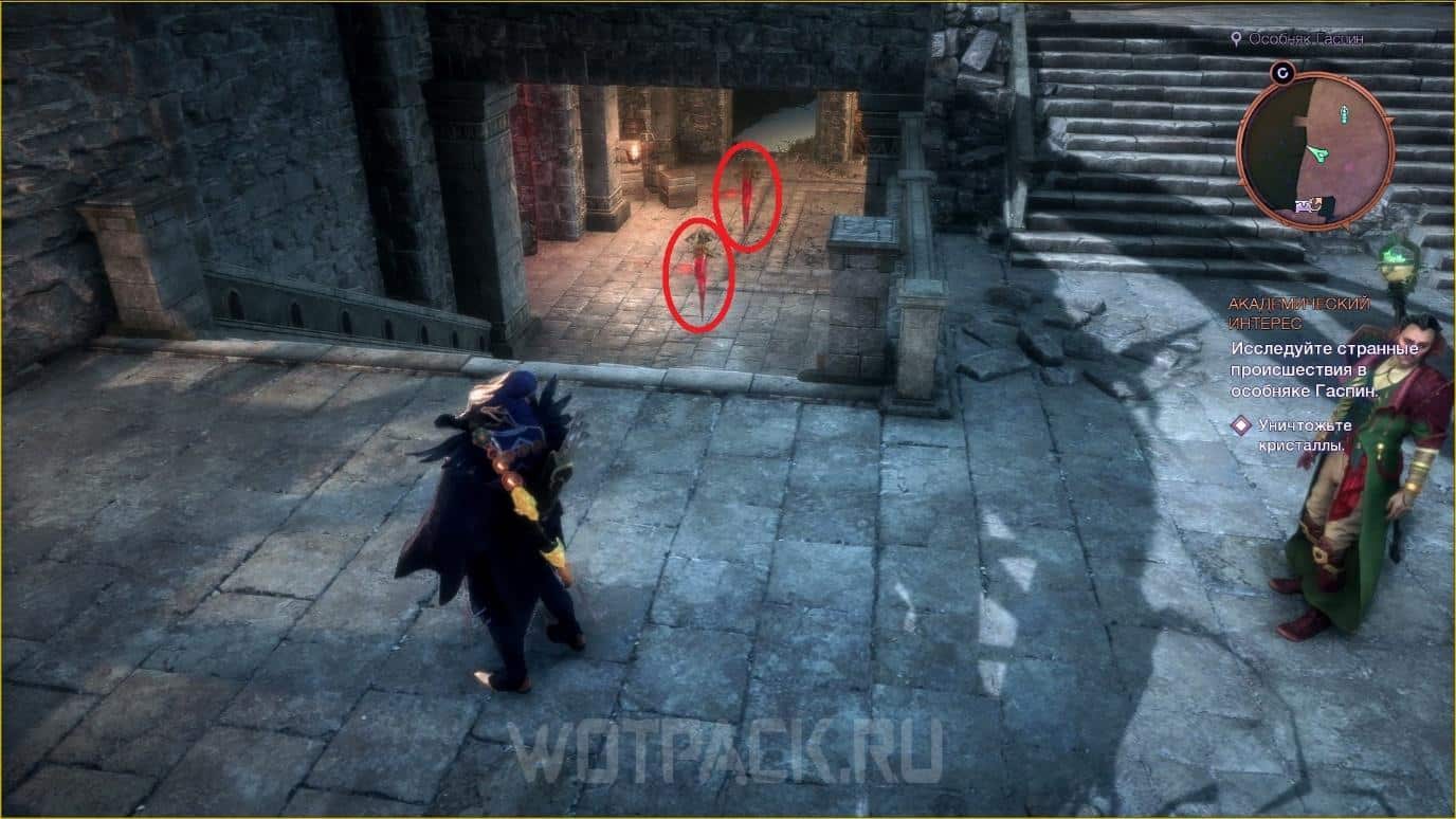 Во дворе особняка Гаспин обнаружите несколько венатори и еще больше кристаллов. Убейте противников и начинайте по порядку разбивать источники магической энергии. На территории поместья также есть небольшая головоломка со статуями, которая не относится к квесту.