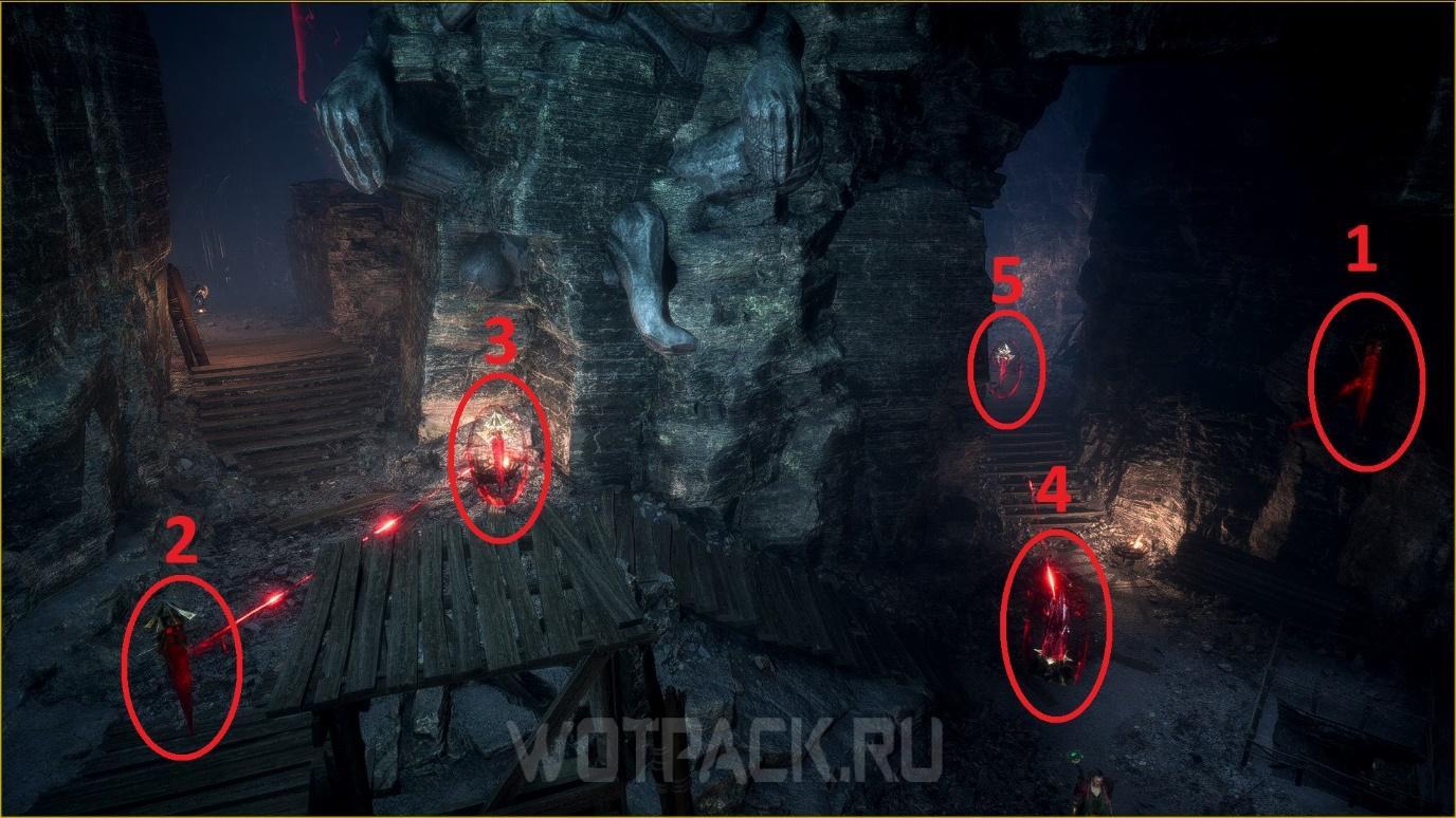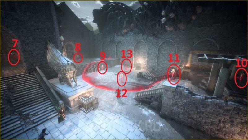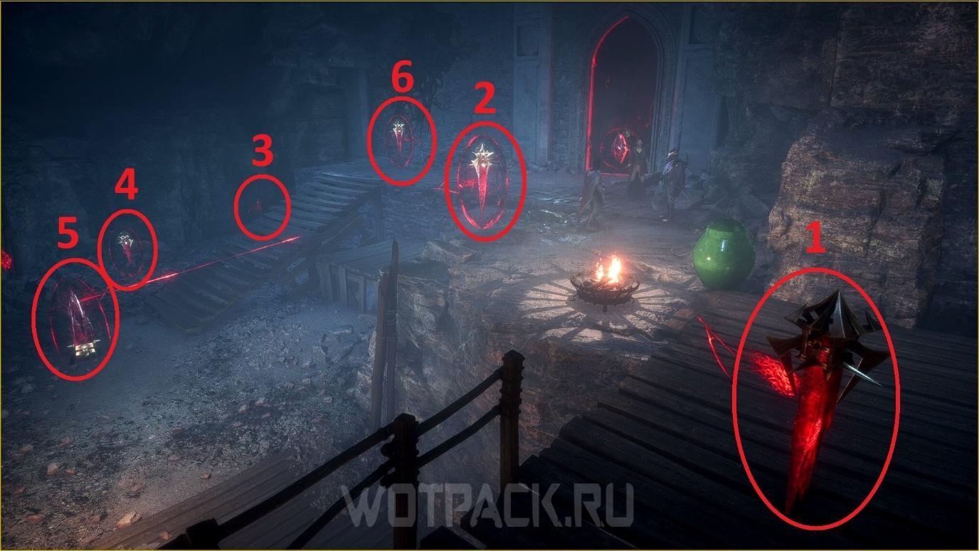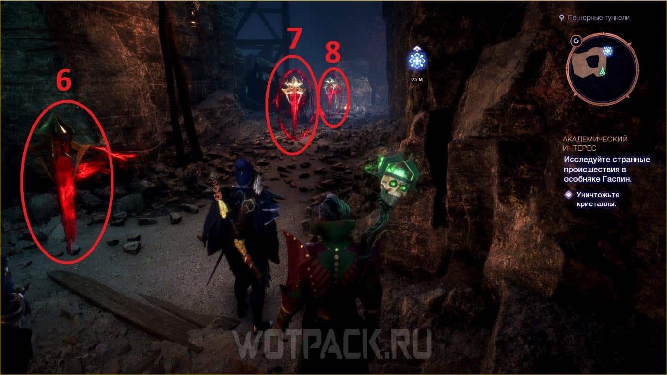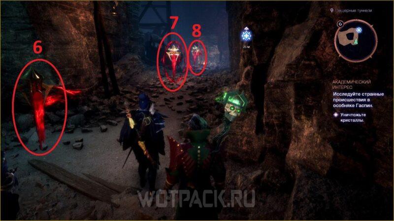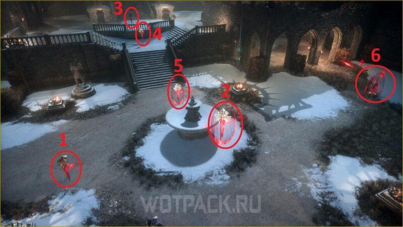 Во дворе особняка Гаспин обнаружите несколько венатори и еще больше кристаллов. Убейте противников и начинайте по порядку разбивать источники магической энергии. На территории поместья также есть небольшая головоломка со статуями, которая не относится к квесту.