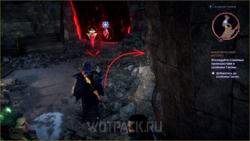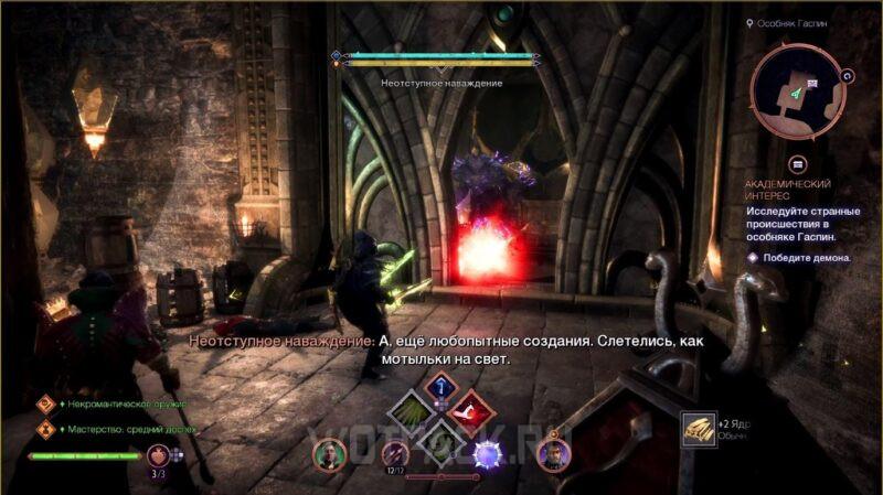 Оказавшись внутри, найдите источник барьеров. В подвале можно взаимодействовать с необычно выглядящей стеной. Используйте на ней лириумный кинжал, после чего откроется проход, из которого появится демон Неотступное наваждение. Вместе с ним команду атакуют две Тени.