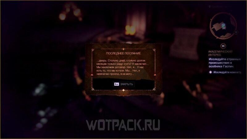 После победы над врагами обыщите комнату, из которой появился демон. Рядом с одним из скелетов в центре помещения обнаружите Последнее послание.