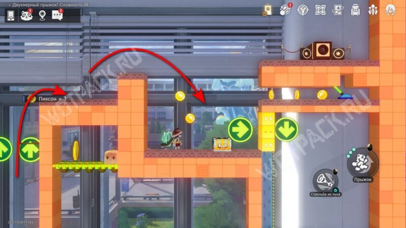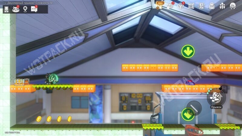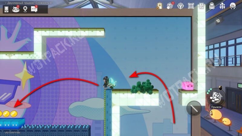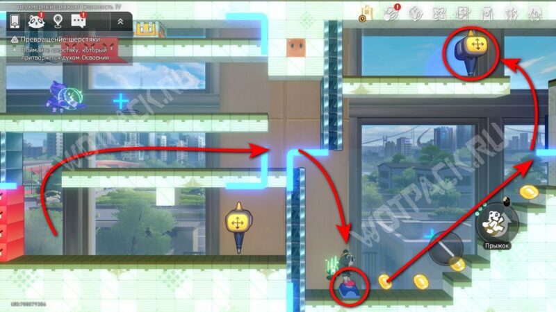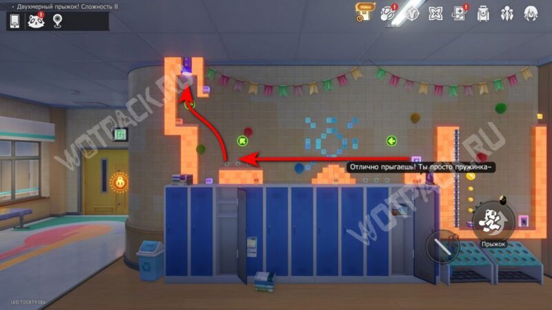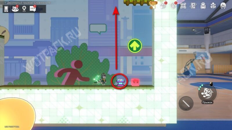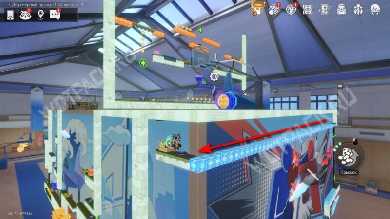 Поднимите механизм в центре спортзала и взаимодействуйте с левым Двухмерным прыжком.