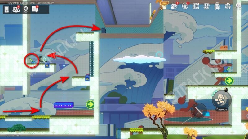 От прошлого сокровища вернитесь к месту, где заходили в скрытый проход. С помощью фиолетовой платформы поднимитесь выше и воспользуйтесь рычагом.