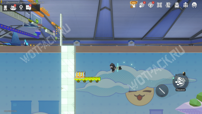 Наверху сверните на зеленую дорожку и дождитесь, когда приплывет облако. Доехав на нем до конца, пропрыгайте по исчезающим кубикам и снова залезьте выше.