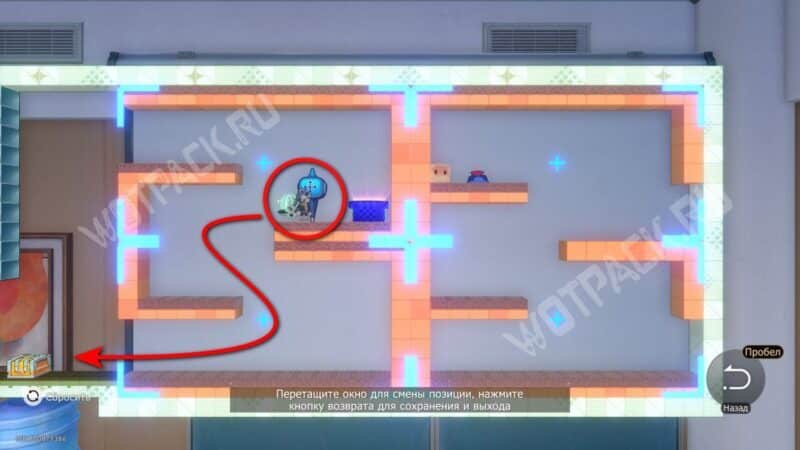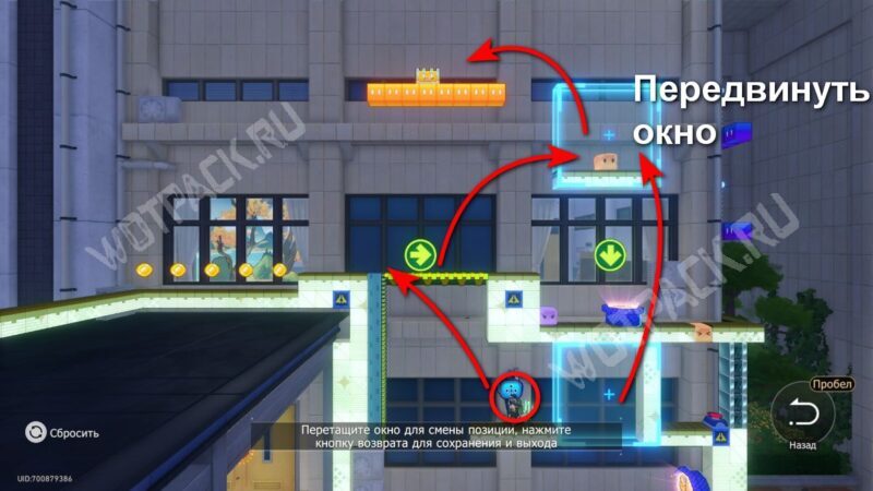 Чтобы добраться до контейнера, поменяйте два окна так, чтобы платформа с эфемером стала «ступенькой» для прыжка к сундуку.