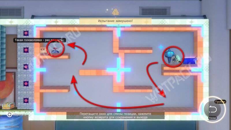 Взаимодействуйте с механизмом и поменяйте окна местами. Взорвите преграды и пройдите ко второму устройству.