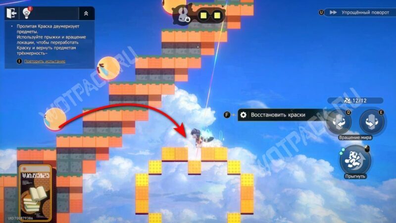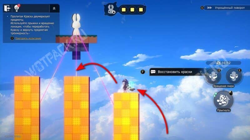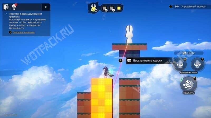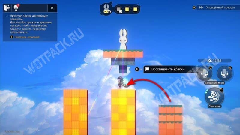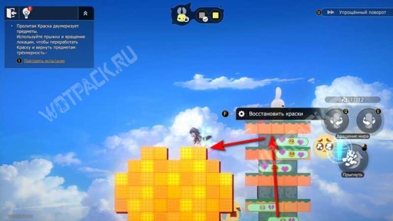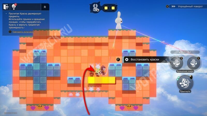 Не поворачивая конструкцию, залезьте по «лестнице» из блоков и спрыгните на сердце справа. После этого нажмите поворот по часовой стрелке (кнопка «Q» на ПК) и заберите краски слева. Не забудьте взять награды.