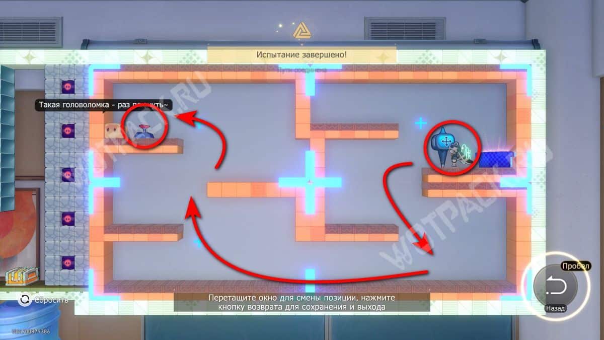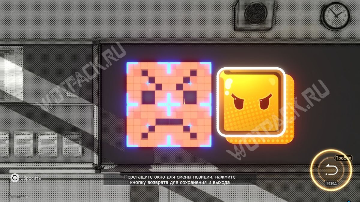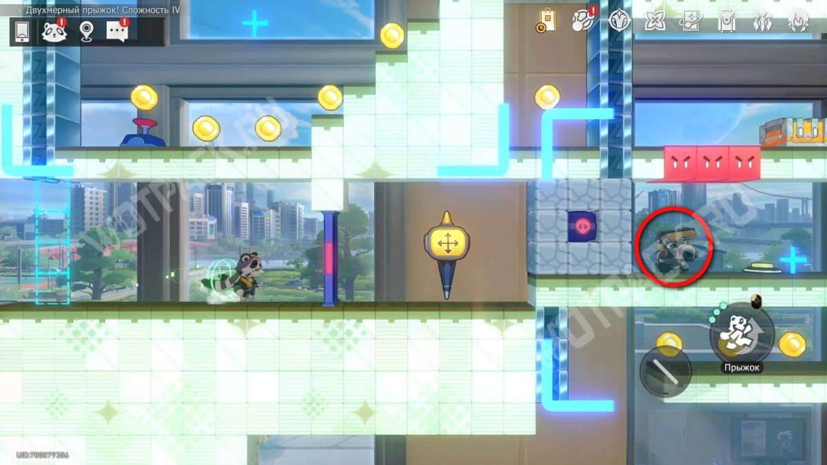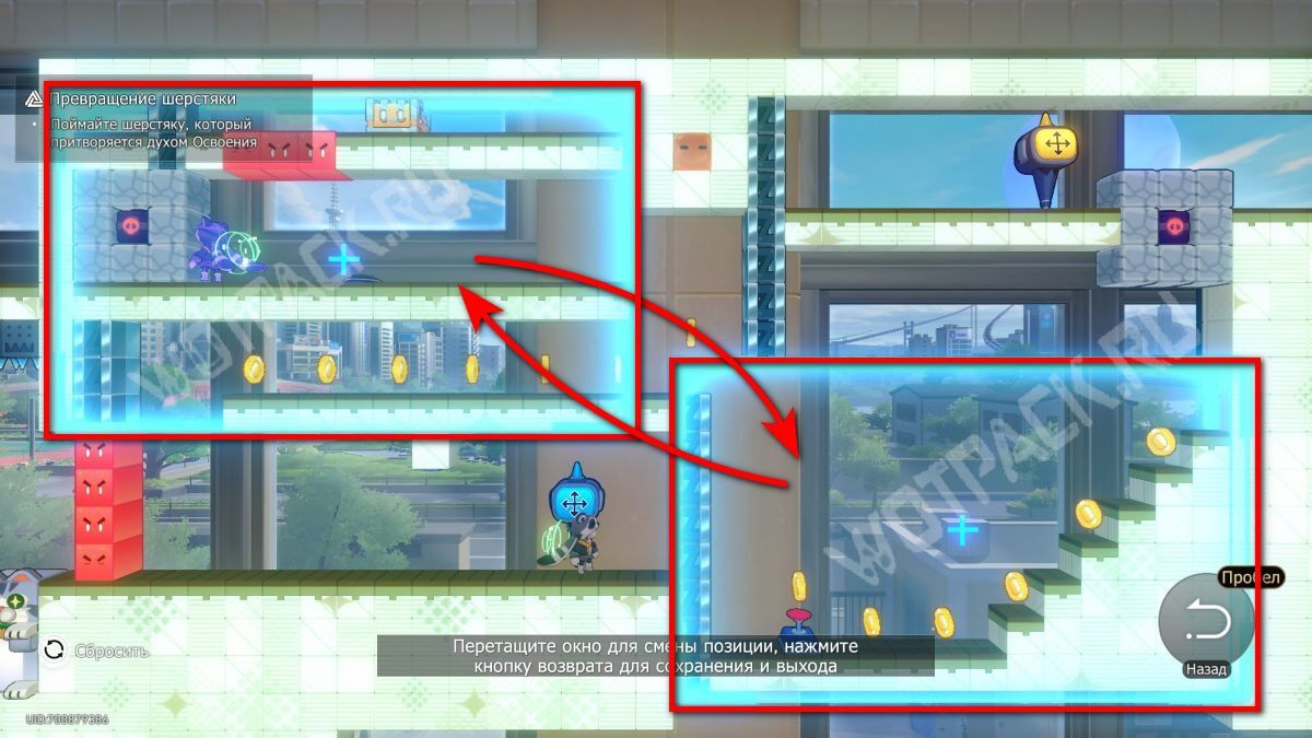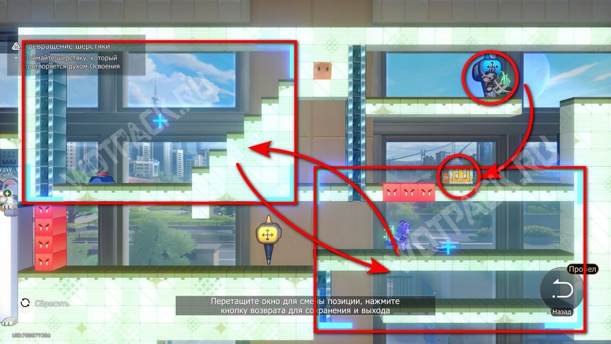 Чтобы добраться до контейнера, поменяйте два окна так, чтобы платформа с эфемером стала «ступенькой» для прыжка к сундуку.