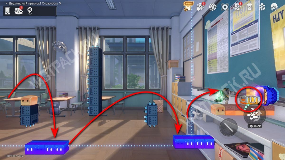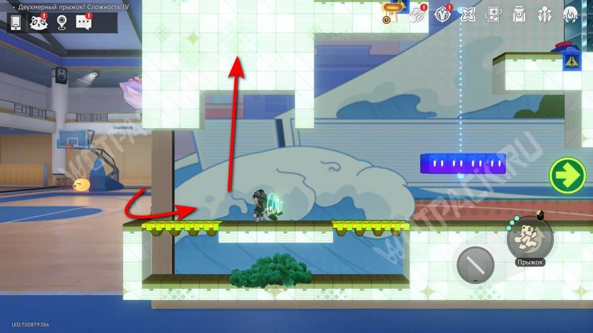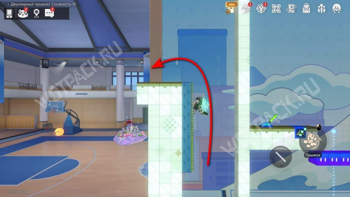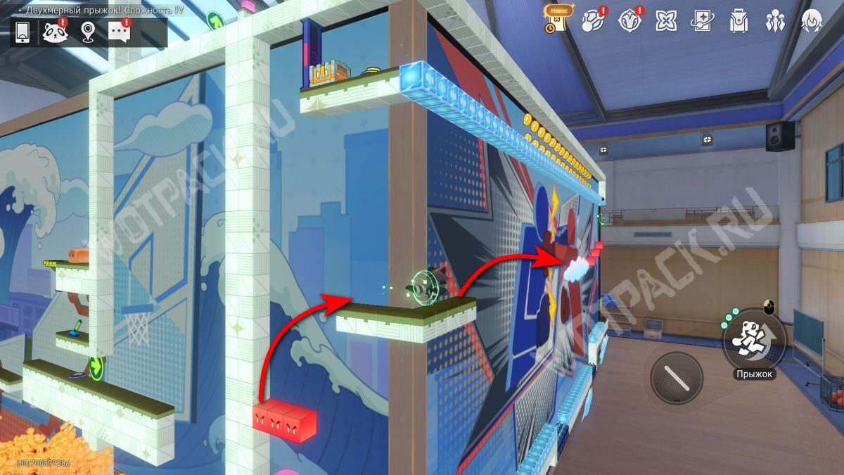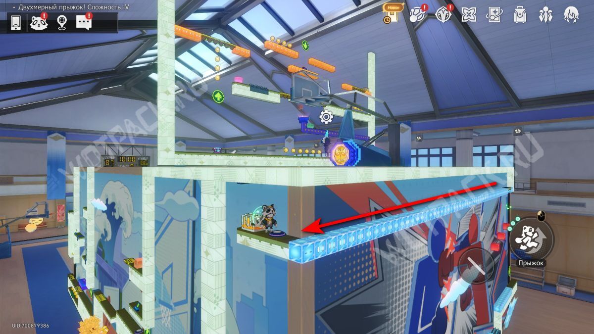 Поднимите механизм в центре спортзала и взаимодействуйте с левым Двухмерным прыжком.