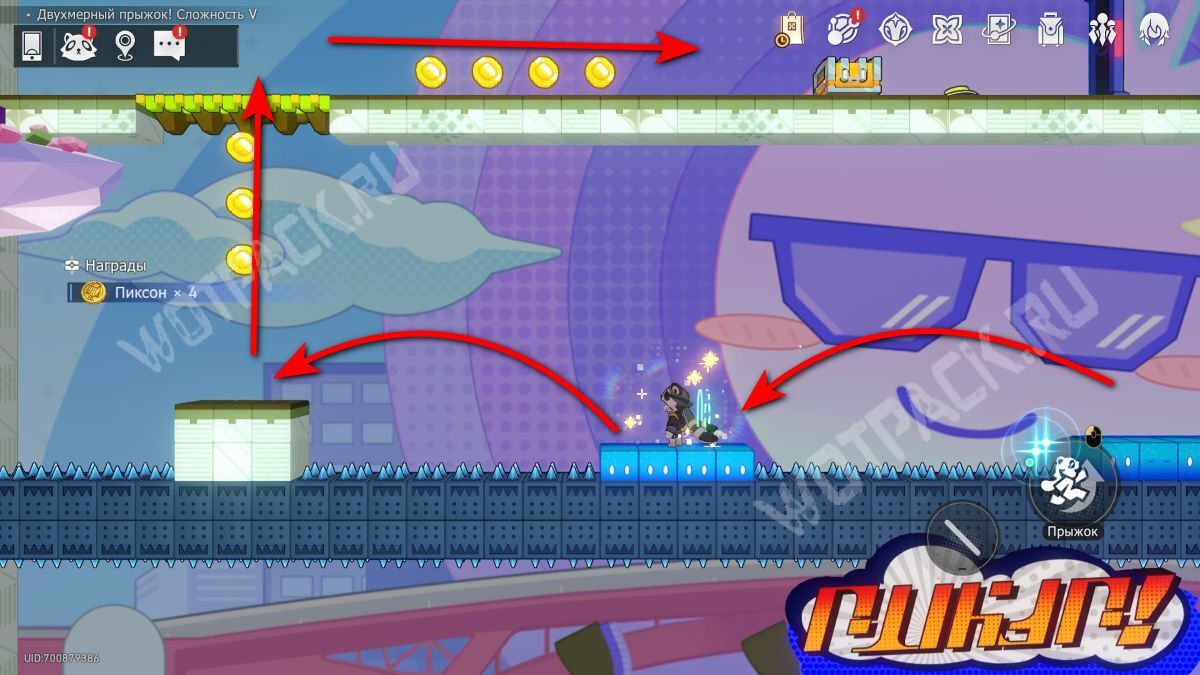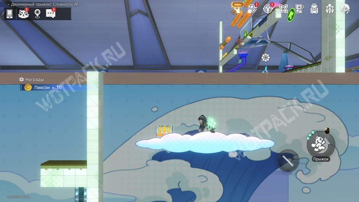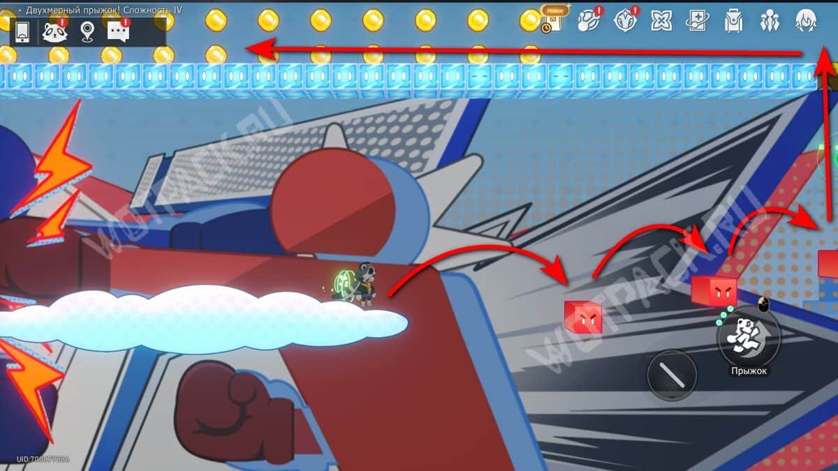 Наверху сверните на зеленую дорожку и дождитесь, когда приплывет облако. Доехав на нем до конца, пропрыгайте по исчезающим кубикам и снова залезьте выше.