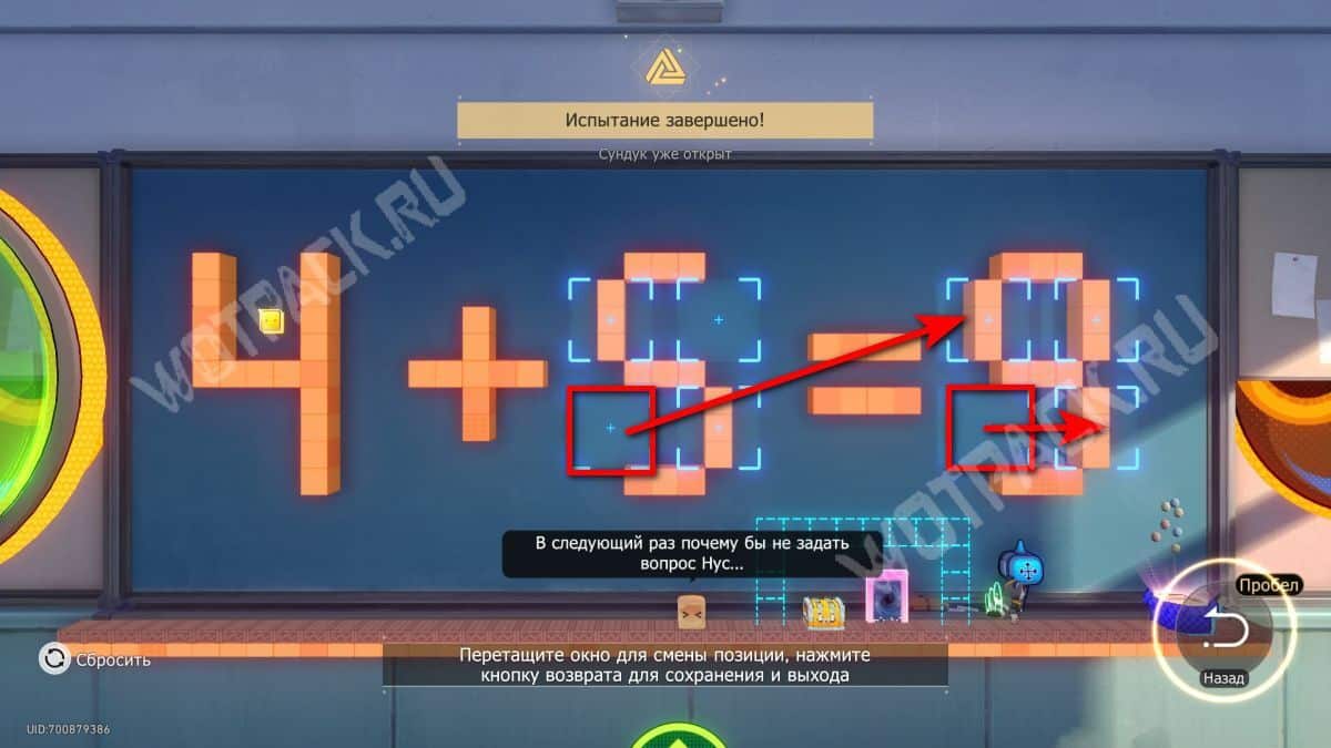 Дойдите до момента, где нужно переставлять окна. Поменяйте картинку так, чтобы получился пример «4+5=9». Для этого: