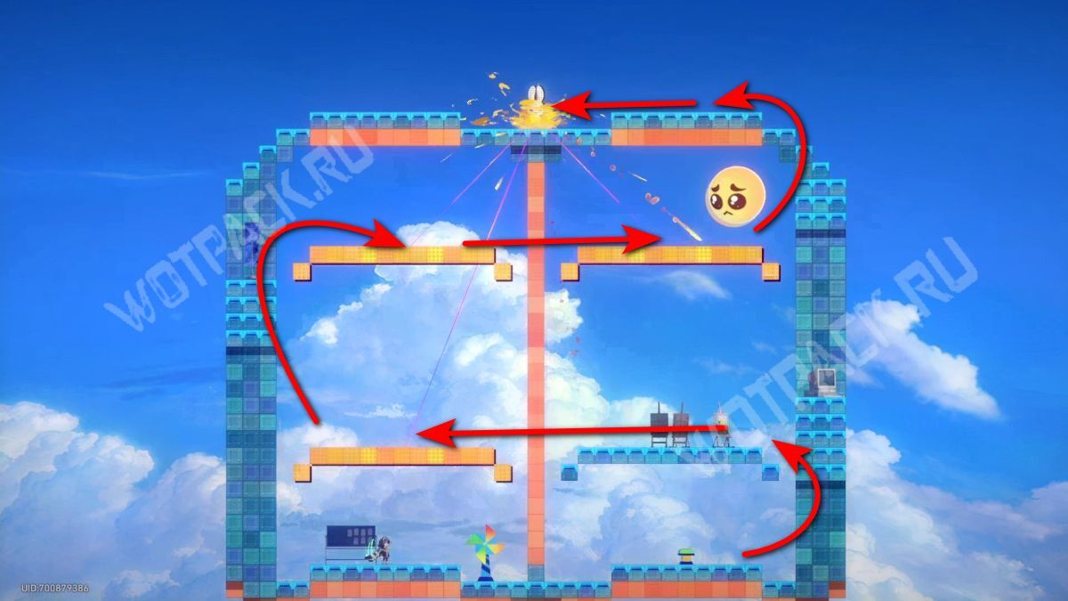 Внутри двигайтесь направо до большого пространства с облаками наверху. Через платформы в правой стороны области заберитесь к облакам и возьмите контейнер.