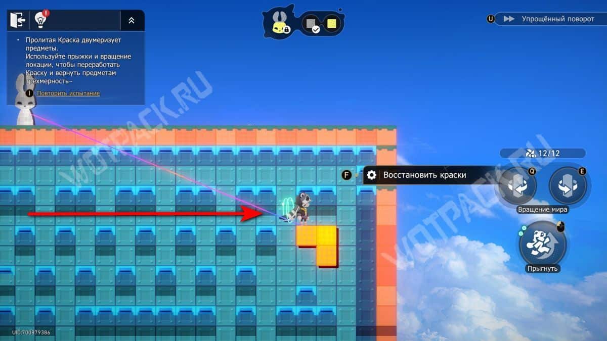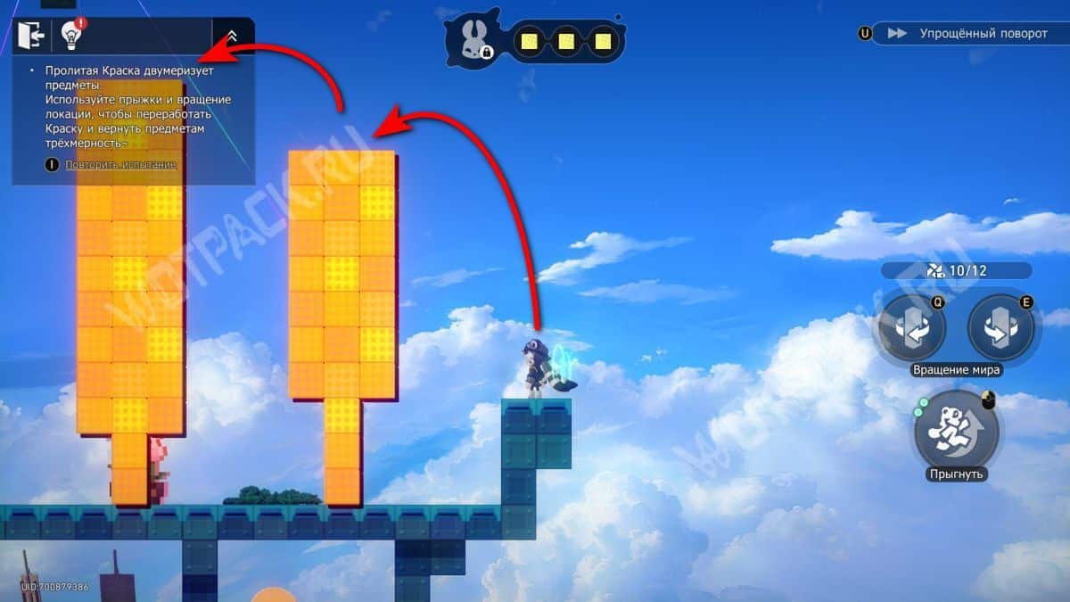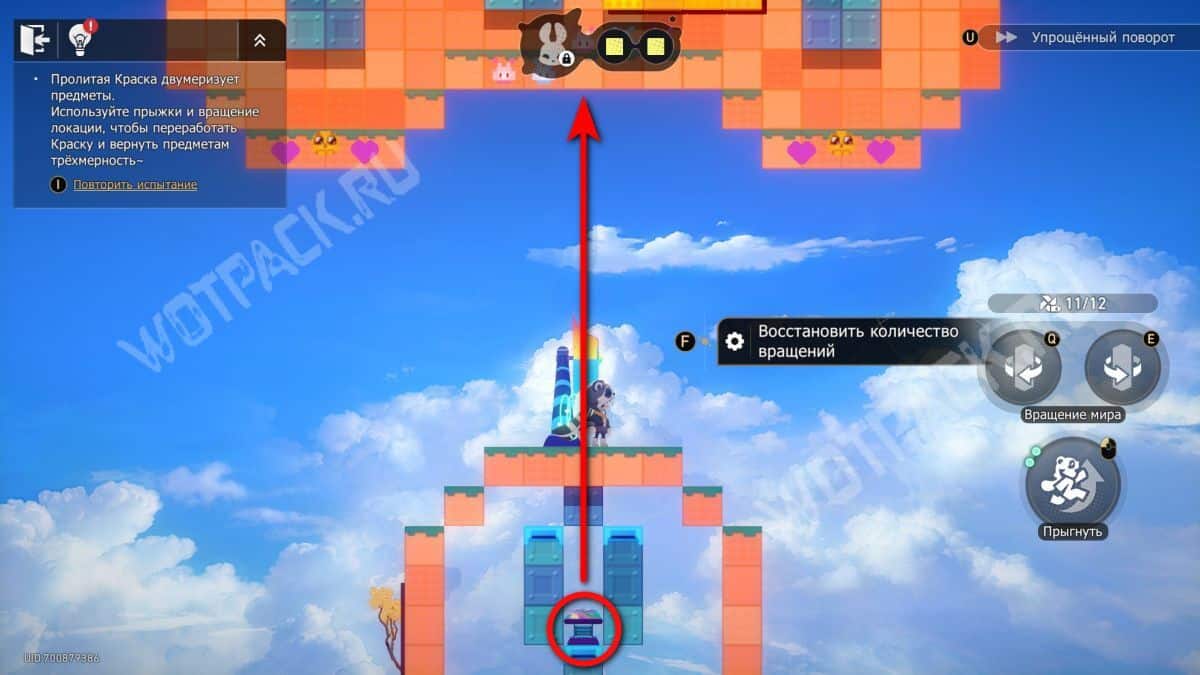 Не поворачивая конструкцию, залезьте по «лестнице» из блоков и спрыгните на сердце справа. После этого нажмите поворот по часовой стрелке (кнопка «Q» на ПК) и заберите краски слева. Не забудьте взять награды.