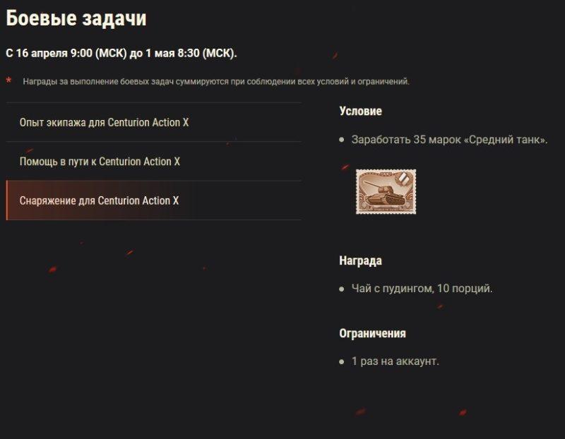 В середине апреля в игре World of Tanks стартовала акция «В бой на Centurion Action X». Для ветки средних танков Британии действуют специальные задания и скидки. Каждая машина прокачиваемой ветки получила индивидуальную боевую задачу. Помимо этого, на протяжении всего события будет доступно три общих задачи, которые можно выполнять на всей технике, попадающей под акцию.