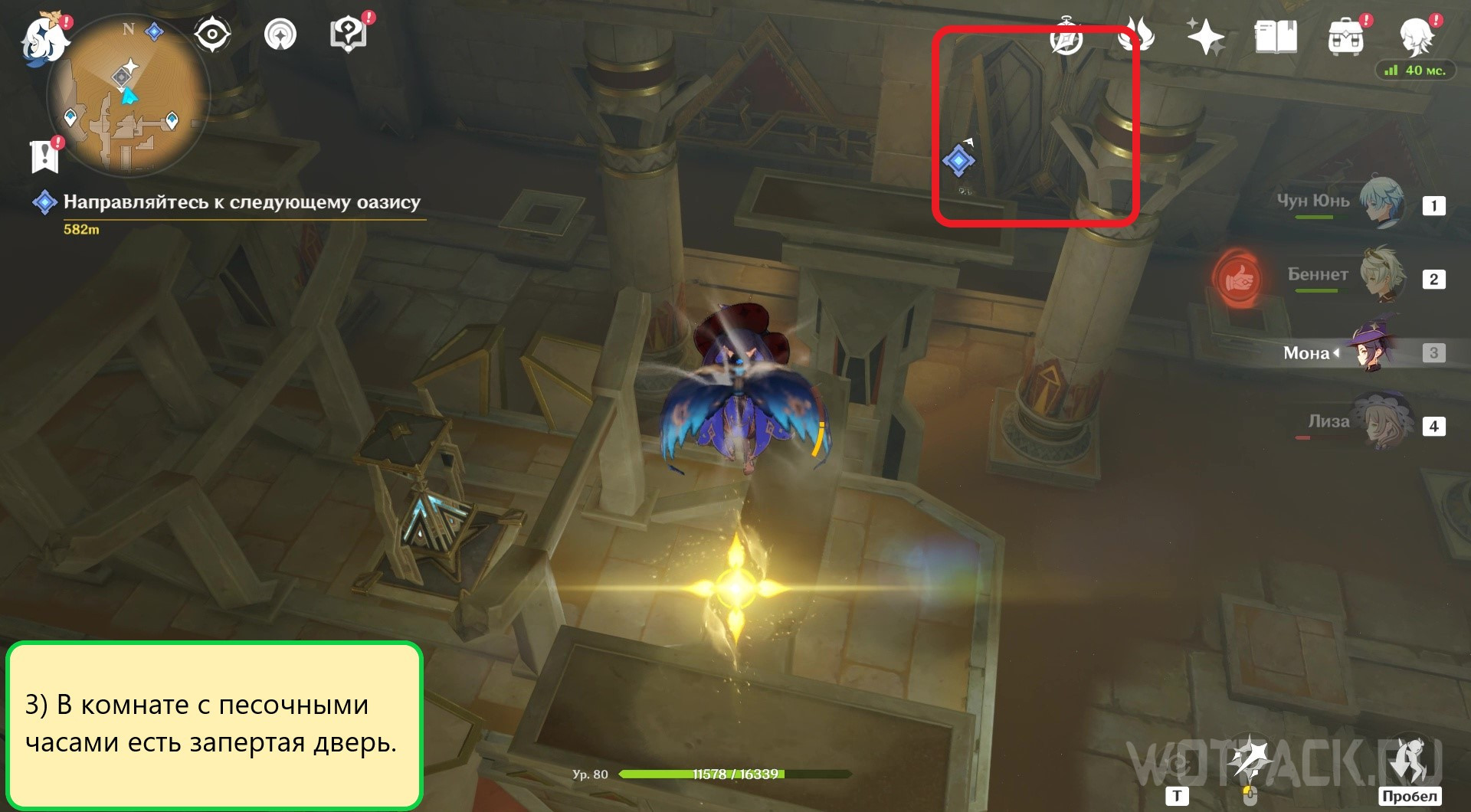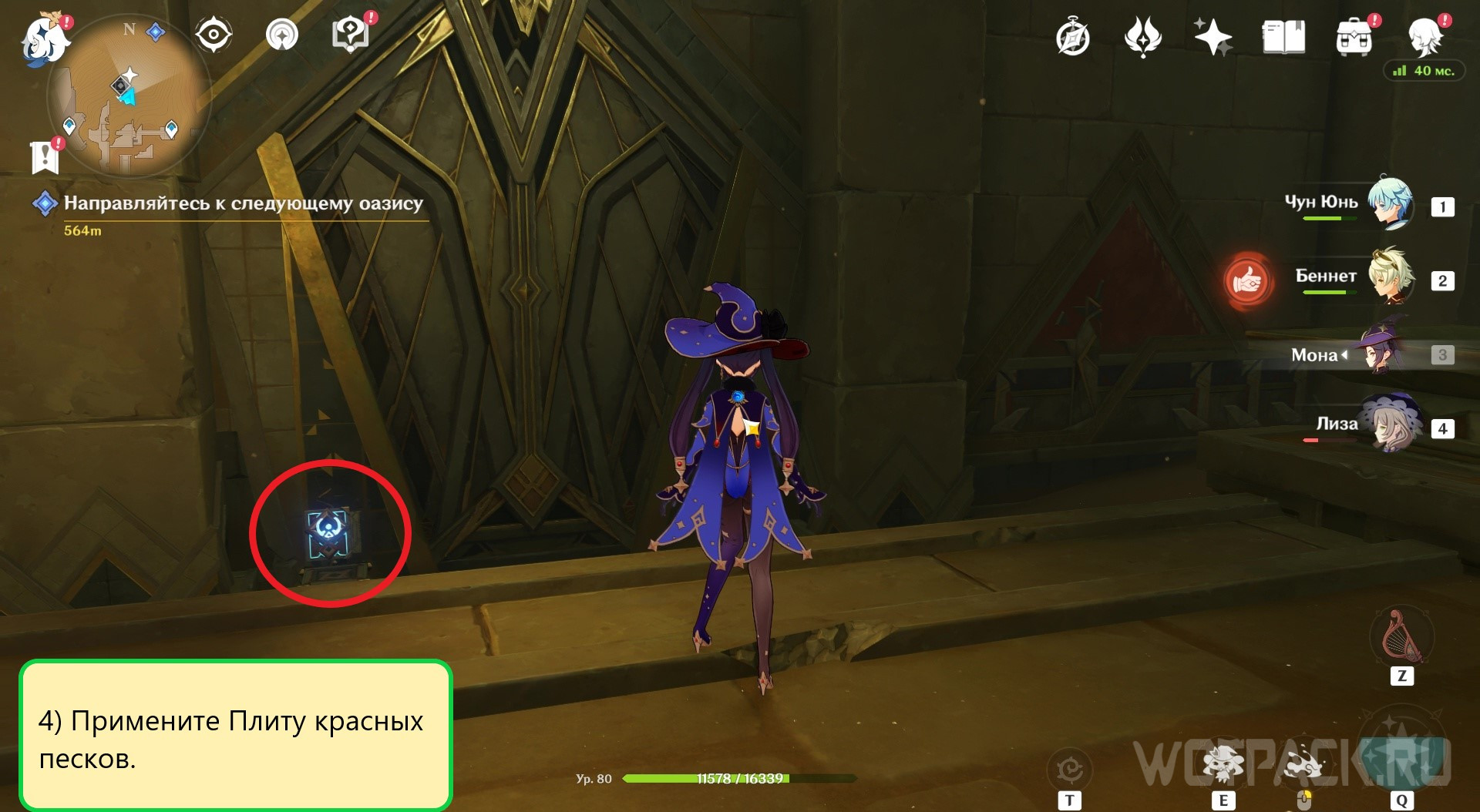 По результату у Путешественника на руках окажется Плита красных песков, которая будет достаточно прокачана для получения доступа к данжу. Телепортируйтесь к точке на юго-востоке от маркера подземелья. Войдите в подземный храм, который проходили в квесте Введение в кабинетную археологию. В первом зале поверните направо, в комнату с песочными часами. На противоположной стороне комнаты есть дверь, открываемая с помощью плиты.