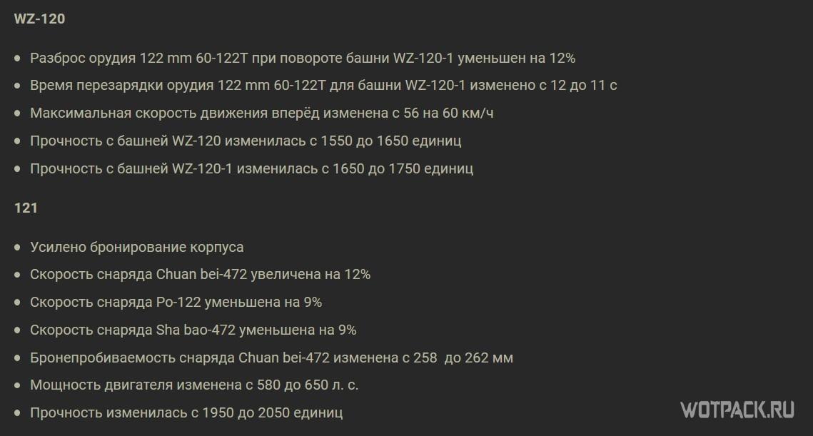 WZ-120 теперь станет более эффективным и универсальным бойцом для прорыва с фланга. Хорошую маневренность и огневую мощь дополнили повышением ХП и увеличением максимальной скорости до 60 км/ч, чтобы он имел возможность в числе первых занимать ключевые позиции. Перезарядку топового орудия сократили на 1 секунду, поэтому немного вырос ДПМ. Также эффективности на ближней дистанции прибавит снижение разброса пушки от поворота башни.