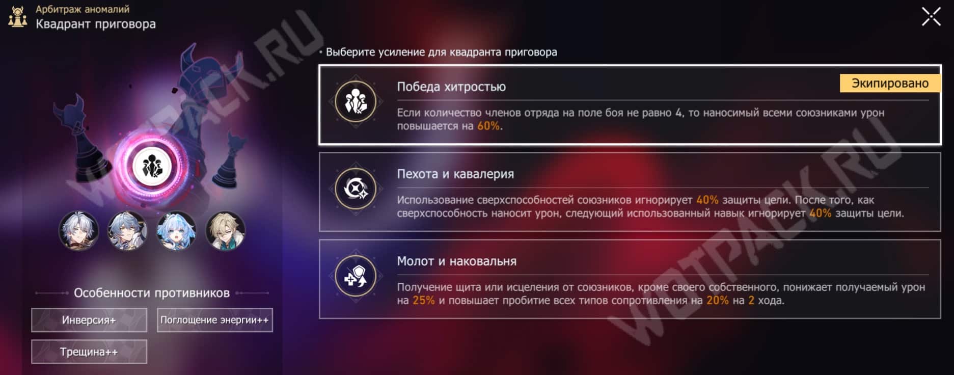 Квадранты приговора — бонусы для команды, которые можно выбрать перед началом сражения. Эти положительные эффекты могут значительно повысить общую силу группы, наделив её уникальными свойствами или усилив основную механику, заложенную в способности выбранного гипер-керри.