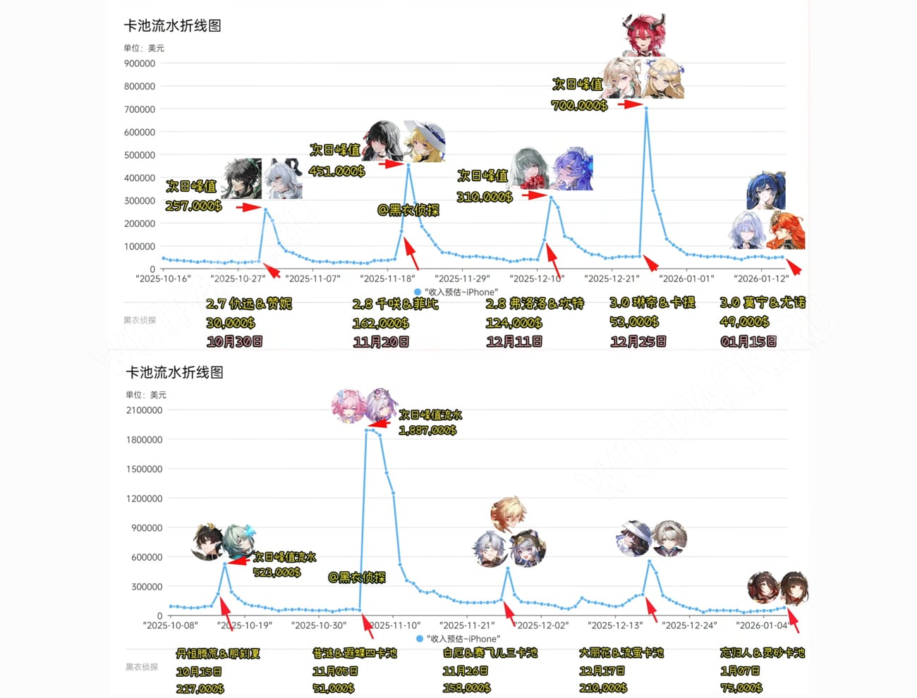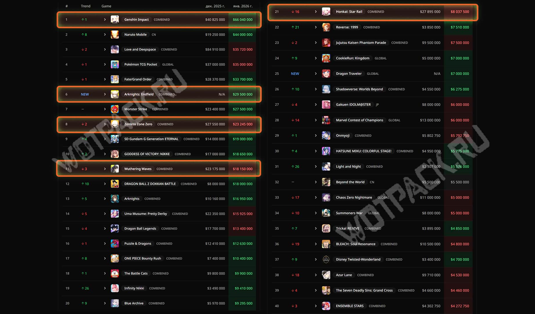 В январе 2026 года среди лидеров оказалась Naruto Mobile с выручкой в $44 000 000 — для неё этот месяц всегда выходит самым прибыльным. Love and Deepspace опустилась на третье место, показав один из худших результатов за пару лет — $35 720 000. Genshin Impact занял первую строку рейтинга, получив донатов на $66 040 000.