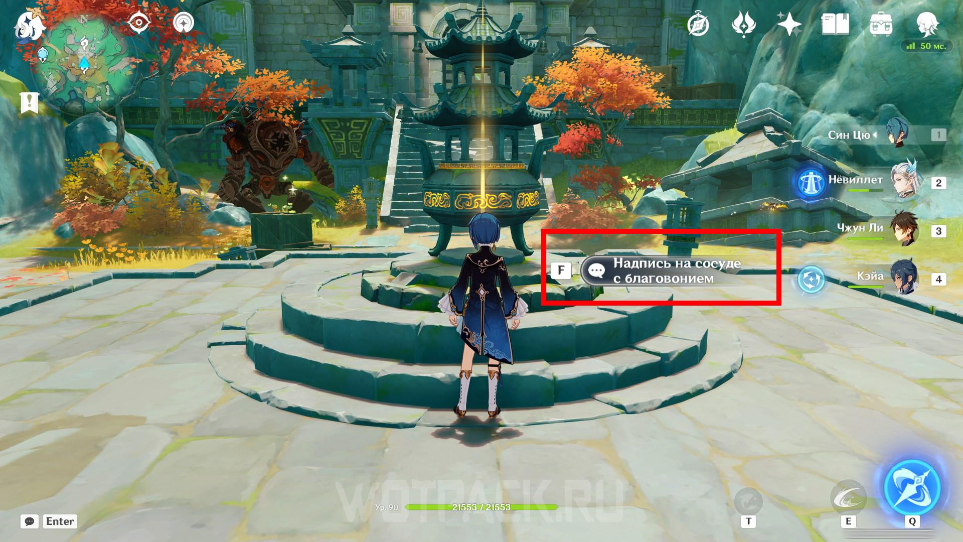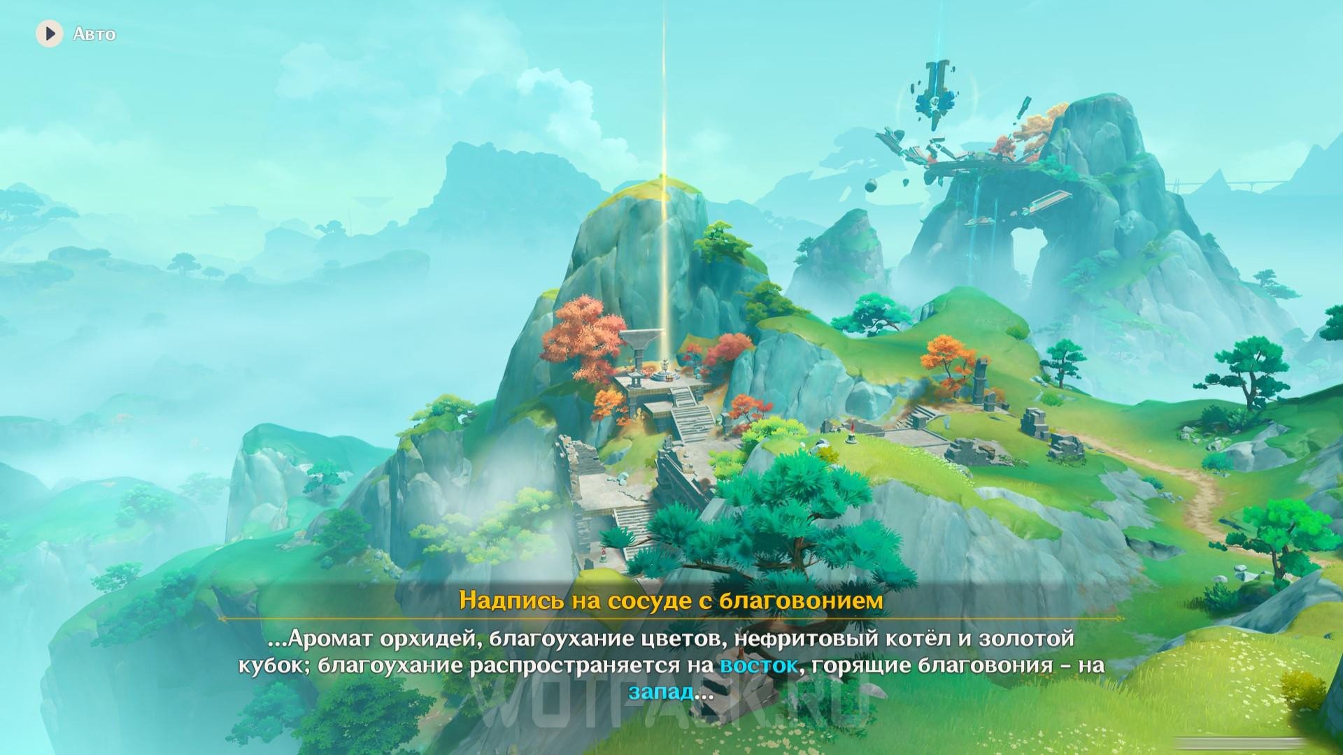 Для того чтобы приступить к головоломке на западе, сначала нужно изучить надпись на сосуде с благовонием. Телепортируйтесь к Стене Чичжан и направляйтесь к большой площади, в центре которой стоит курильница. Изучите ее и ознакомьтесь с подсказками, указывающими на руины на западе.