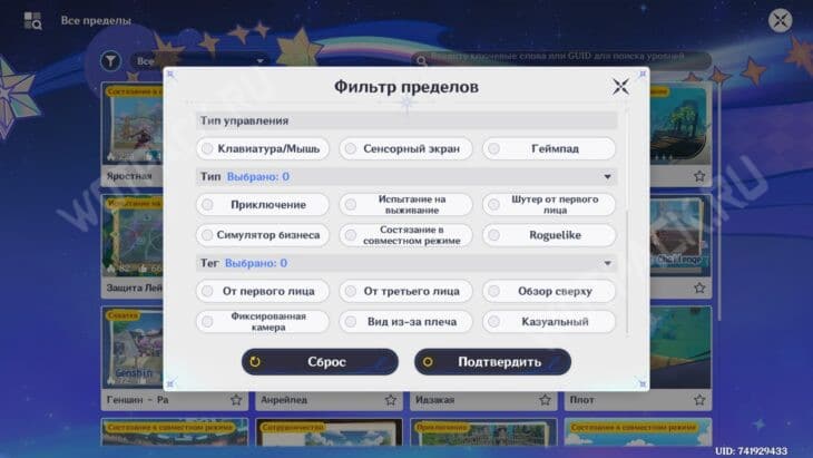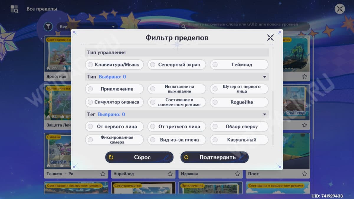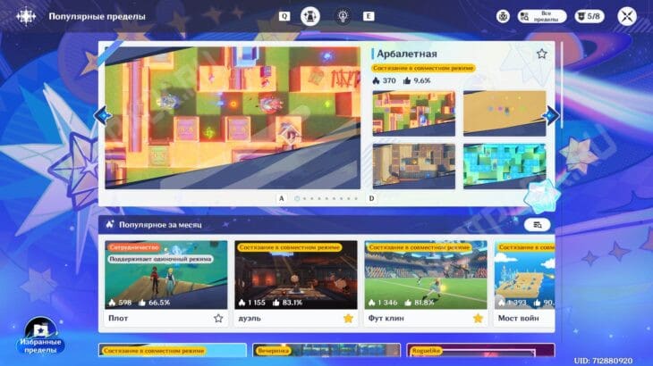 При создании в модуле, а также при поиске в разделах «Популярные пределы» и «Избранные пределы» в меню Паймон, будут доступны как одиночные этапы, так и совместные режимы по различным тегам: