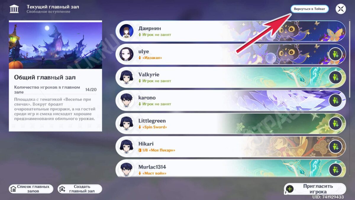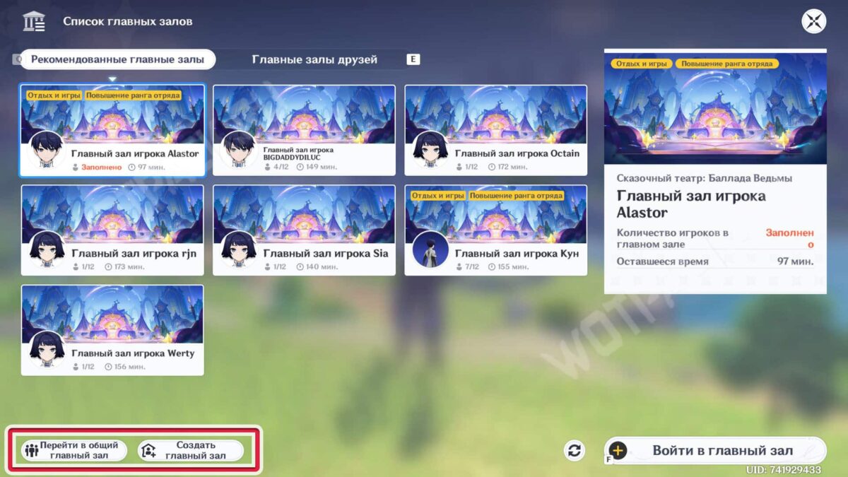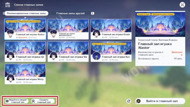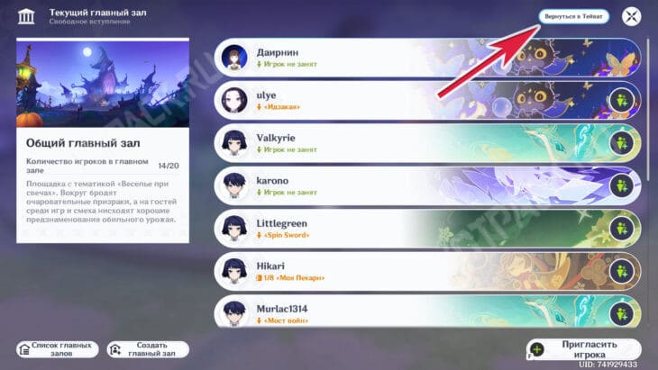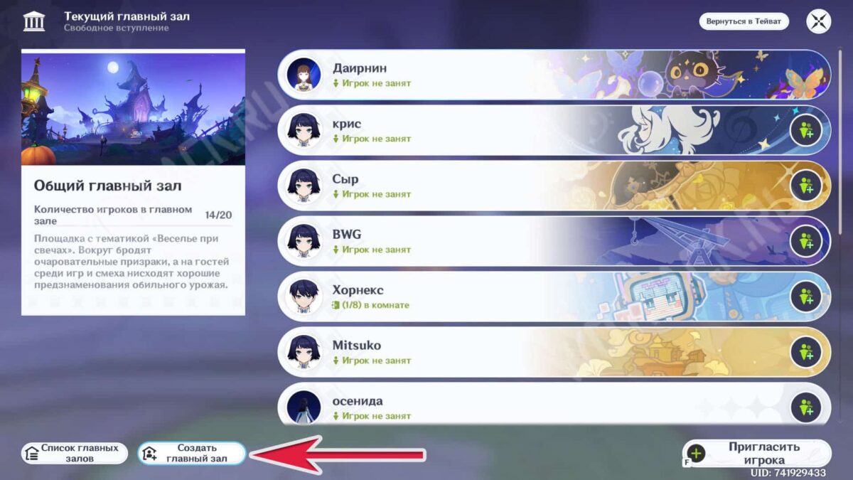 - Нажав в меню Паймон на кнопку «Главный зал», увидите доступные для присоединения лобби других игроков, а также сможете создать свою комнату и посетить случайный общий тематический зал.