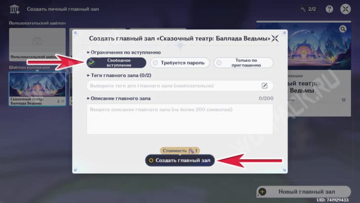Для создания личного лобби достаточно в меню «Главный зал» выбрать «Создать главный зал» в нижнем левом углу экрана. Комната открывается за 1 Ключ торжества, ресурс, возобновляемый раз в 12 часов.