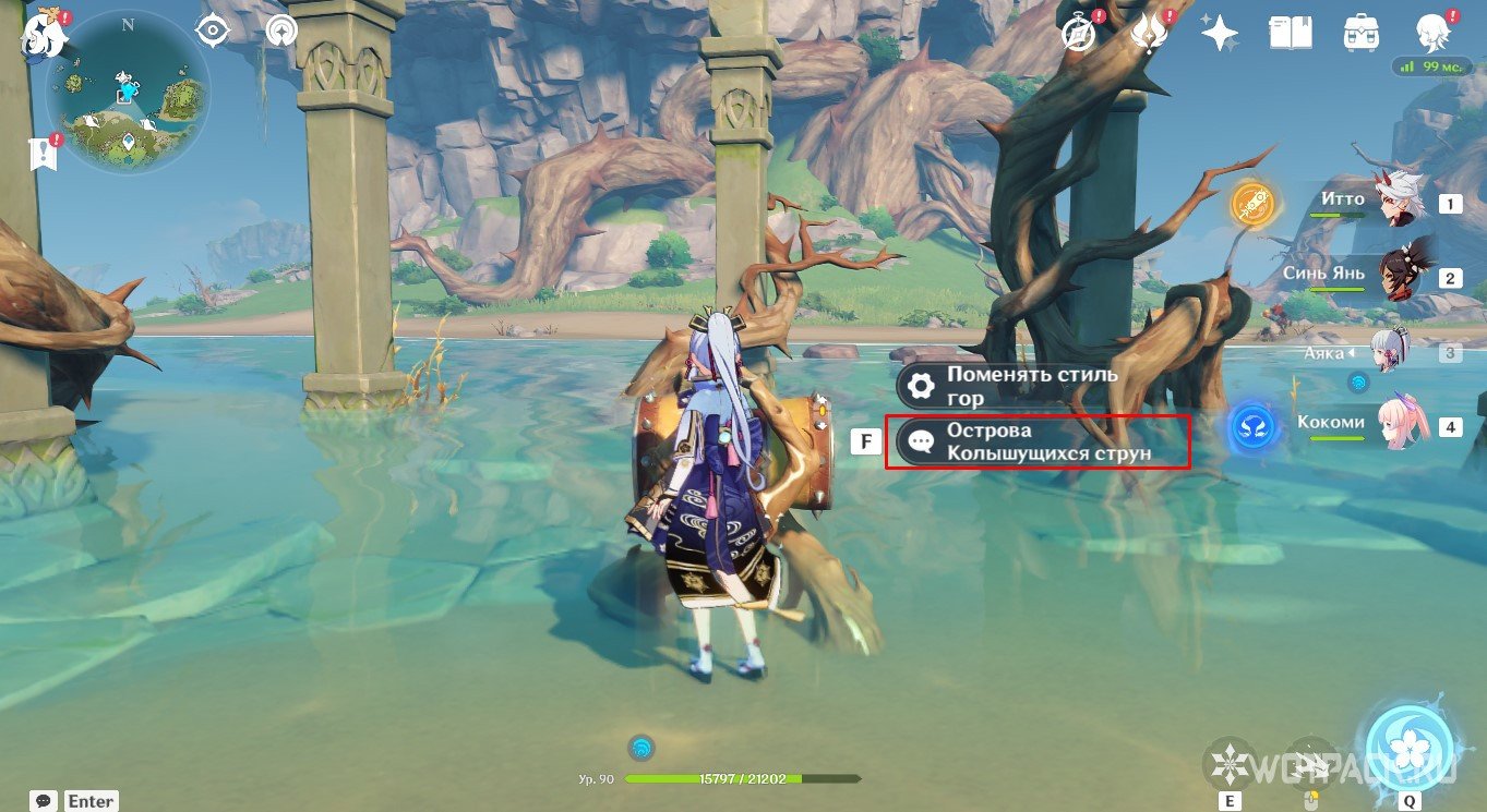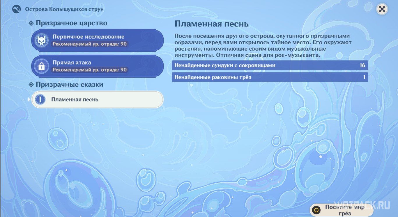 Барабан обладает еще двумя функциями. Подходим к нему и нажимаем Острова колышущихся струн. В появившемся меню можно пройти испытания в Призрачном царстве и получить дополнительные награды. Также можно вернуться в мир грез Синь Янь и пройти его по новой, собрав не найденные сундуки и раковину грез.