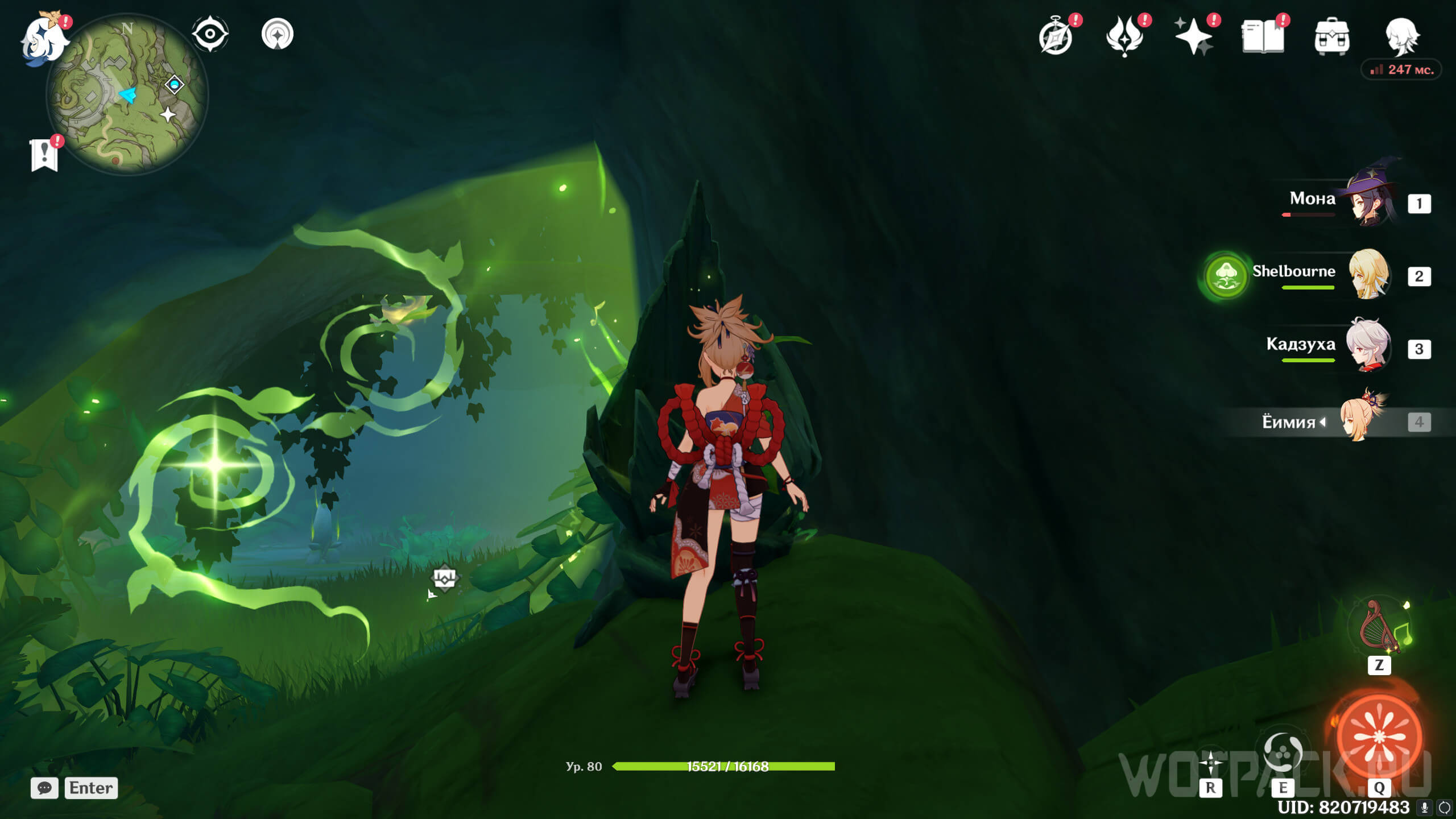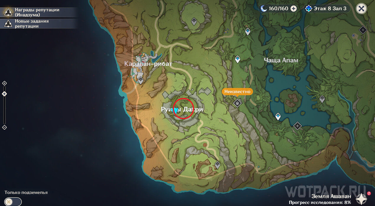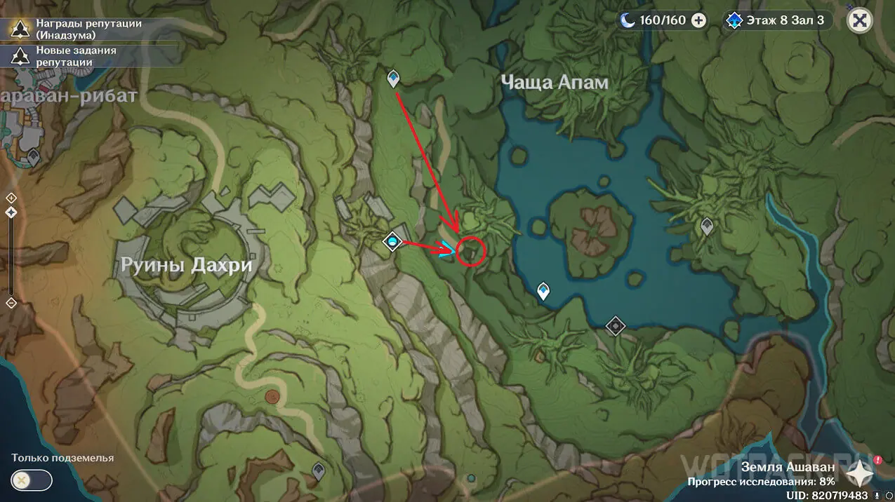 Вход в следующую пещеру расположен со стороны Чащи Апам. Проще всего до него добраться от подземелья Башня презренной гордости. На карте, в конце тропинки (на юге), будет темный круг – спуск вниз. Его легко заметить благодаря четырехлистному символу.