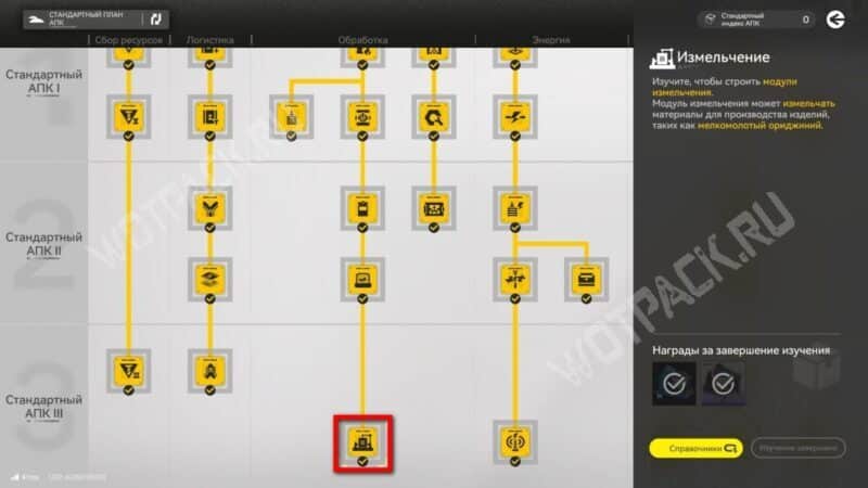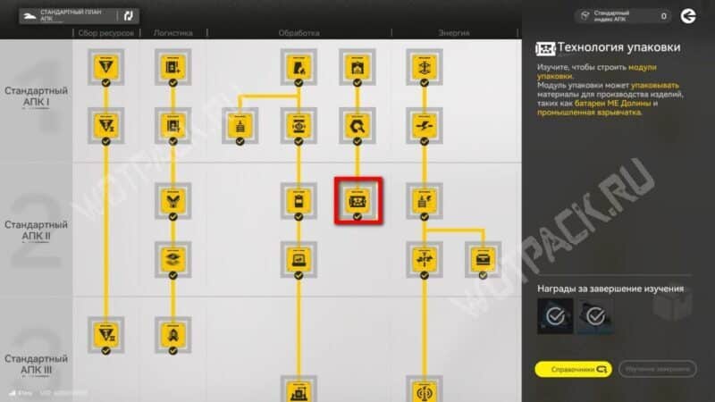 - Модуль упаковки — главное сооружение в цепочке, крафтящее готовые изделия из остальных ресурсов. При достаточном количестве материалов на складе можно пропускать дальнейшие этапы и направлять все компоненты напрямую в него.