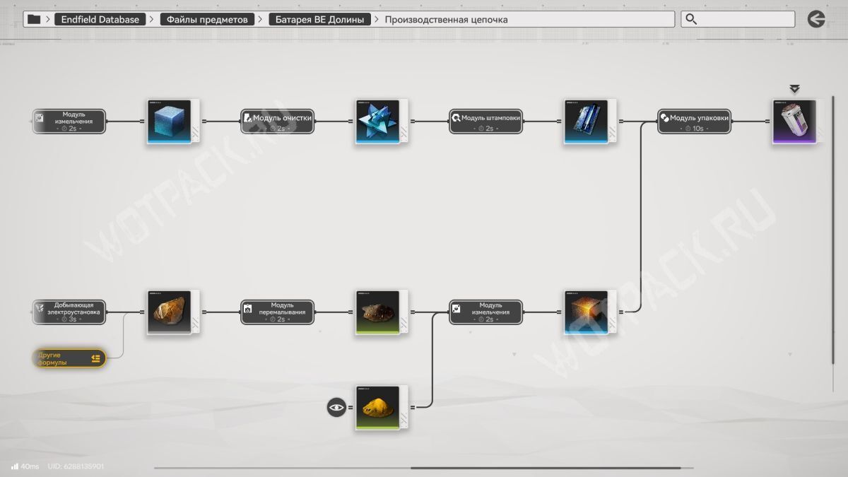 В основу всегда ложится ориджиний как фундаментальный источник энергии на Таллосе 2. Молотая или измельченная руда при помощи упаковки смешивается с аметистовыми, ферриевыми или стальными деталями и на выходе получаются батареи разной редкости.