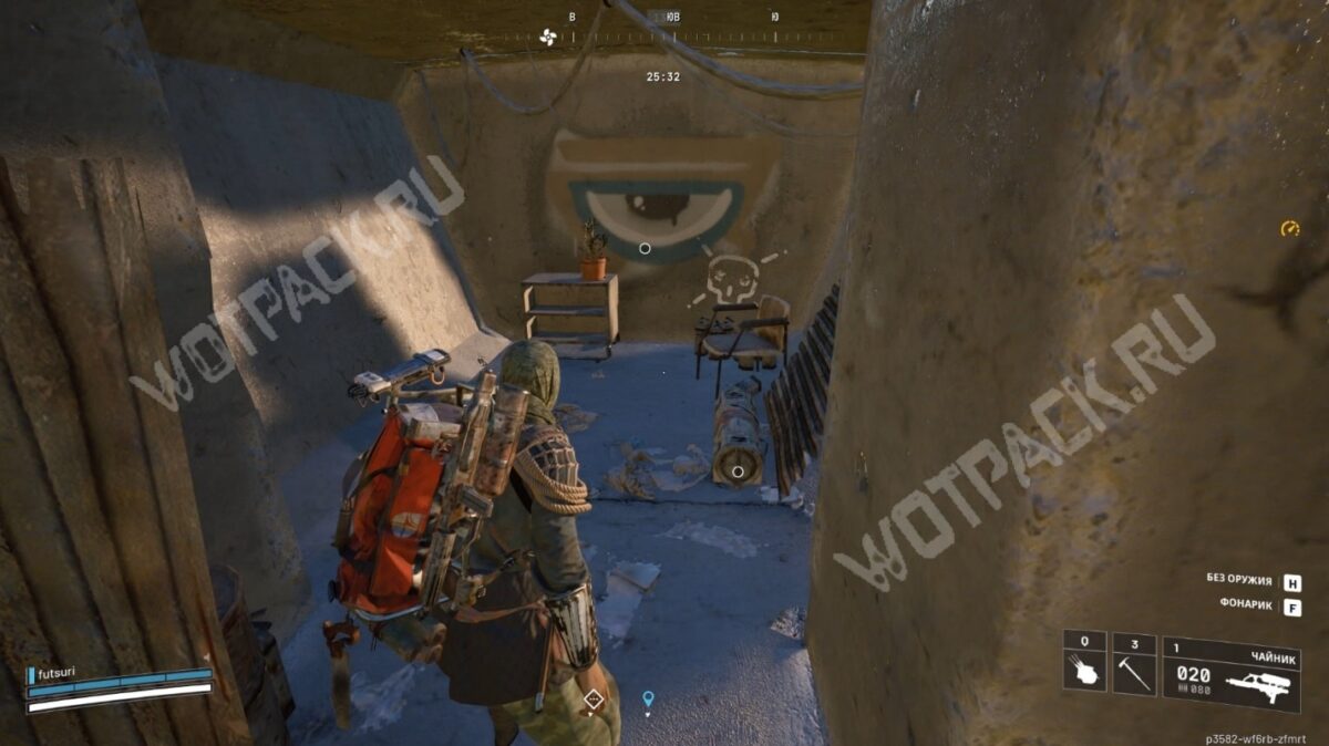 Вновь спуститесь и воспользуйтесь зиплайном. Нужно попасть в отверстие, находящееся внутри опоры моста. Спрыгните с троса за 7–10 метров до конца. Если зацепились за верхнюю часть дороги — нажмите «Ctrl», чтобы спрыгнуть и схватиться пониже. Зайдите в хранилище Бильгуна и сделайте снимок огромного глаза, нарисованного на стене. В этой комнате также нередко можно найти тубус с гранатами или медицинскую сумку.