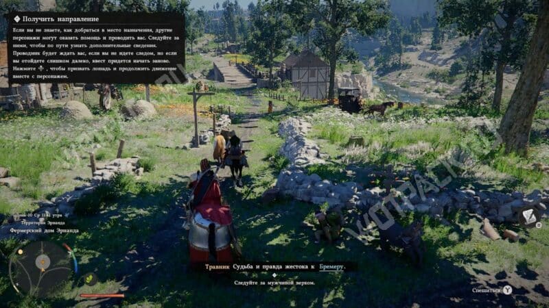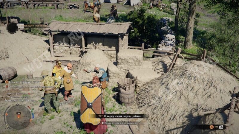 Когда один из мужчин вызовется помочь, следуйте за ним верхом. В такие моменты не обязательно управлять конём: если есть сопровождающий, удерживайте или многократно нажимайте кнопку ускорения, и будете автоматически следовать за ним. Прибыв на место, убейте группу бандитов в лагере.