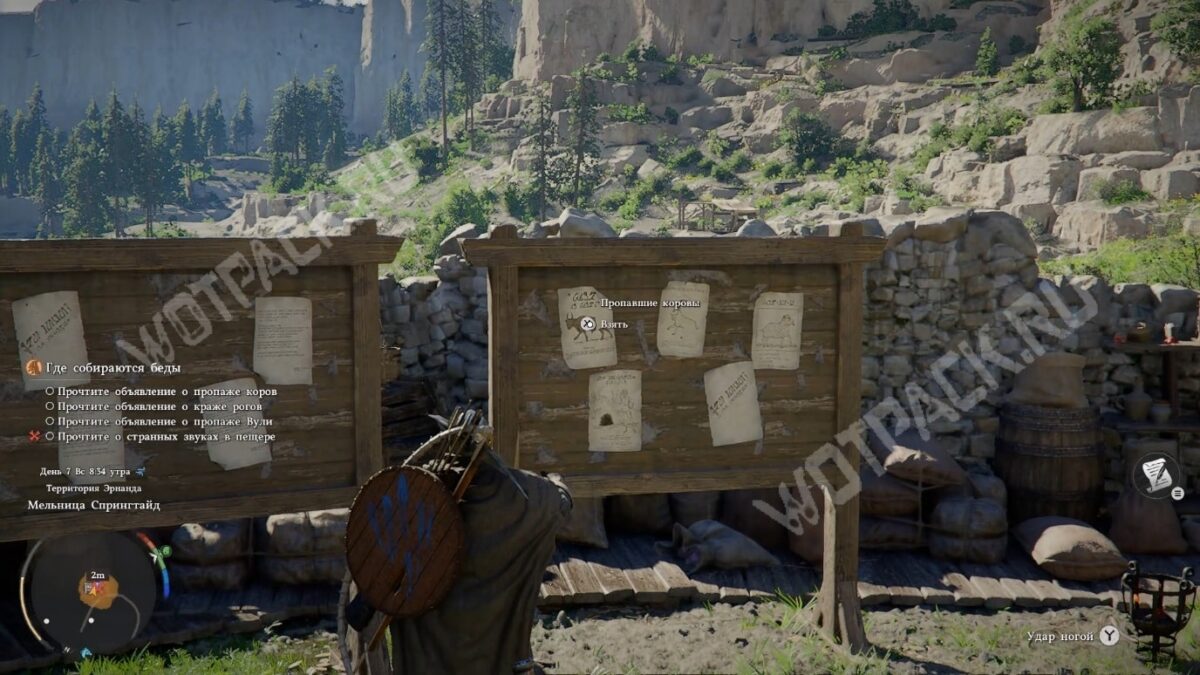 Разобравшись с бандитами в квесте «Тень на реке», подойдите к доске объявлений в окрестностях мельницы Спрингтайд и возьмите с неё заказы. Одним из них будет просьба помочь найти угнанный скот.