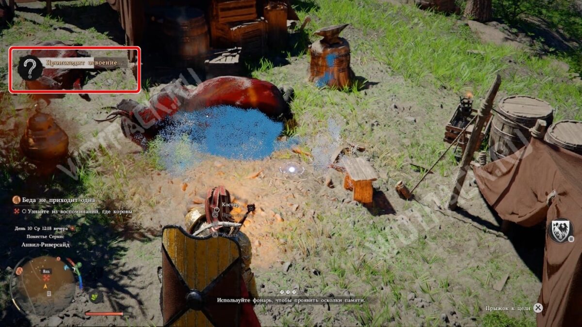 Перейдите в режим направления света и осветите дымку воспоминаний. Для этого зажмите «Ctrl» (или «RB» при игре с контроллера) и направьте прицел на тела коров. Нужно, чтобы в левом верхнем углу начала заполняться шкала «Происходит освоение…».