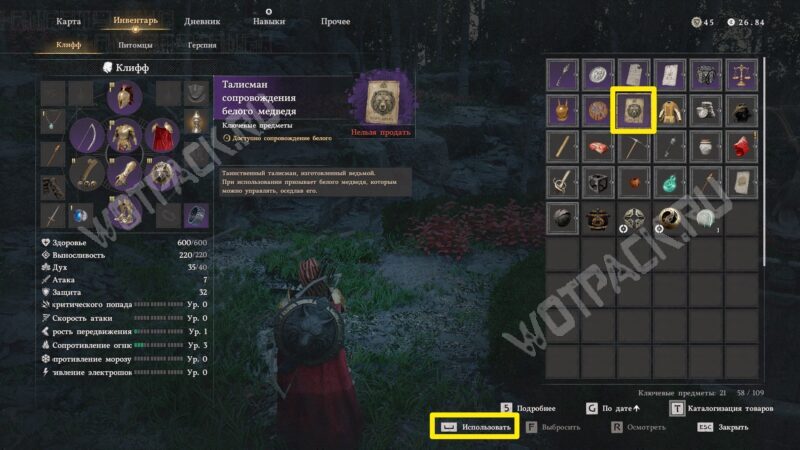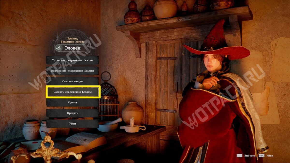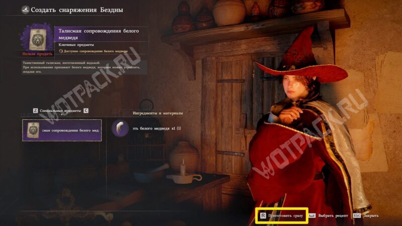 В разговоре с девушкой выберите опцию «Создать снаряжения Бездны», переключитесь на раздел «Специальные предметы» и скрафтите «Талисман сопровождения белого медведя» из его когтя.