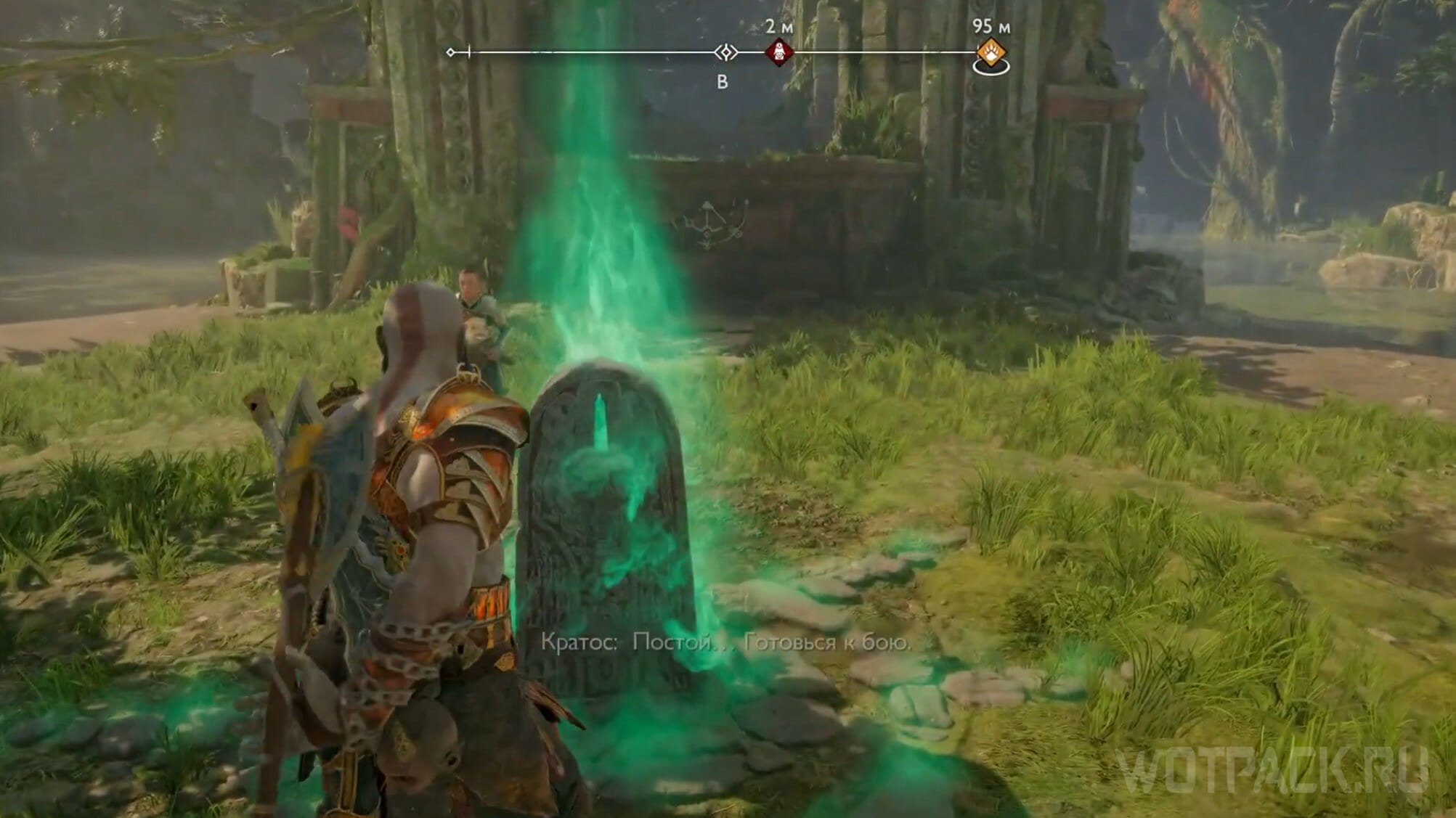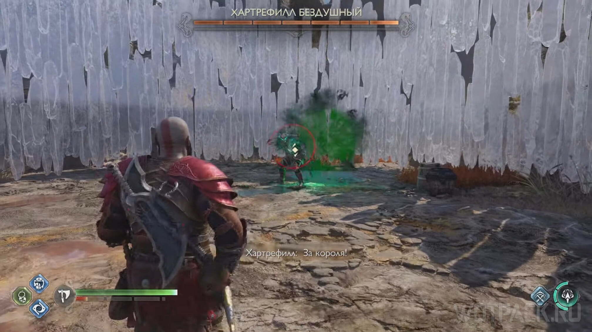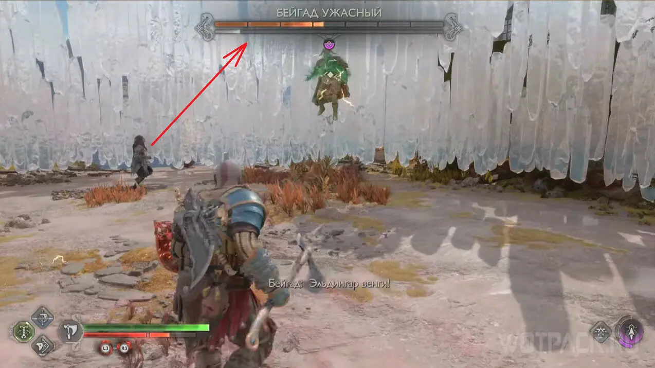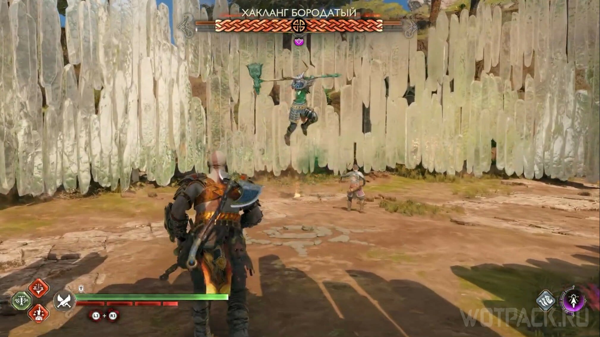 - Хвитсерк взлетает и почти сразу же приземляется в зеленую область, в которой на момент «прыжка» стоит Кратос.