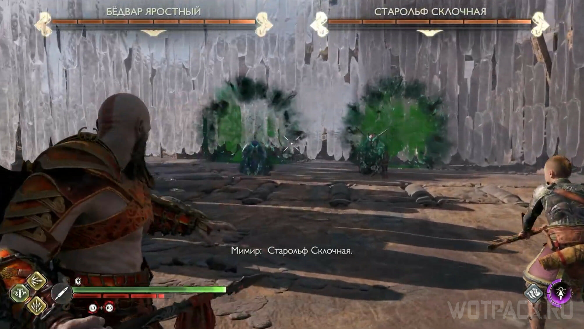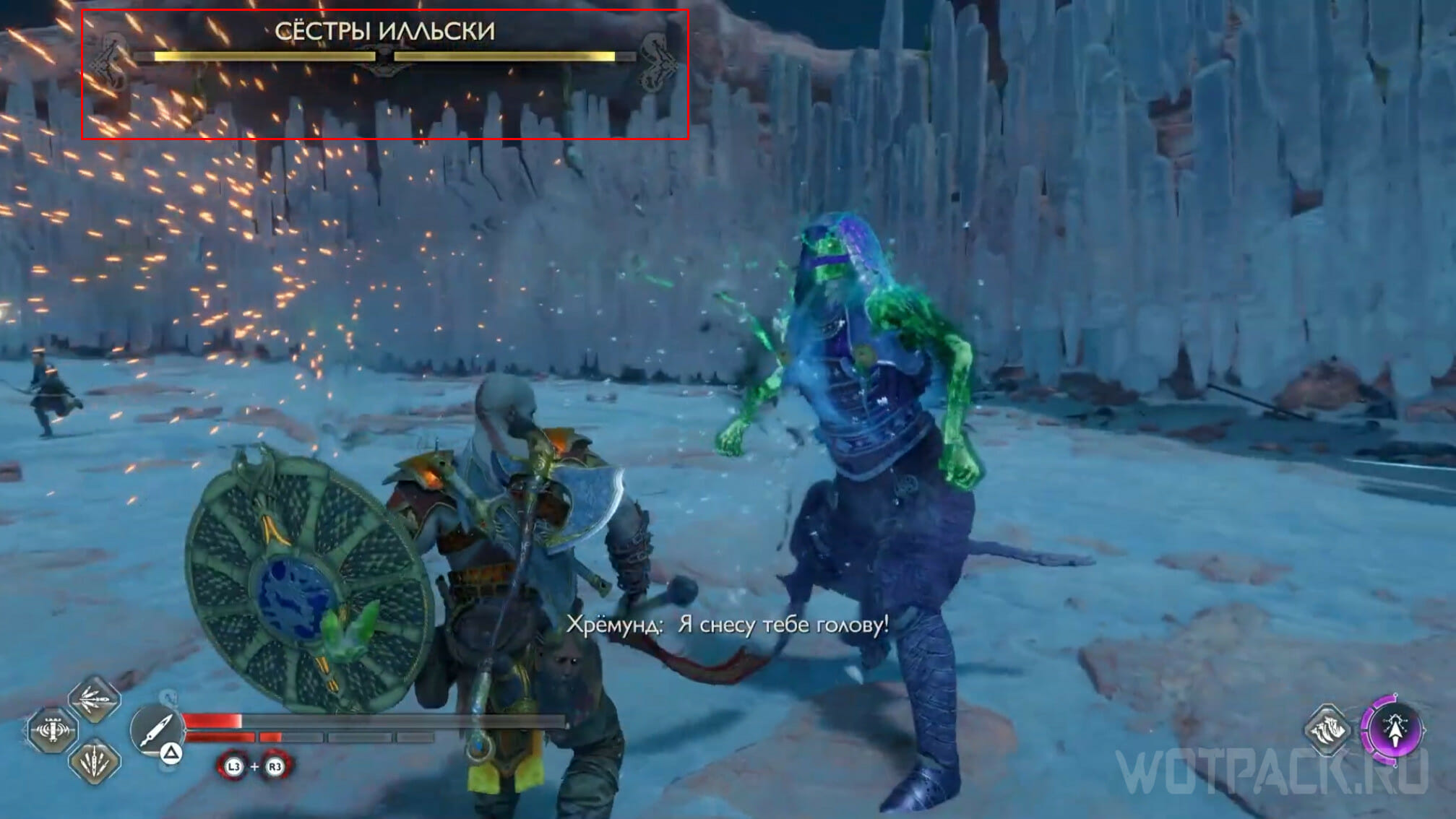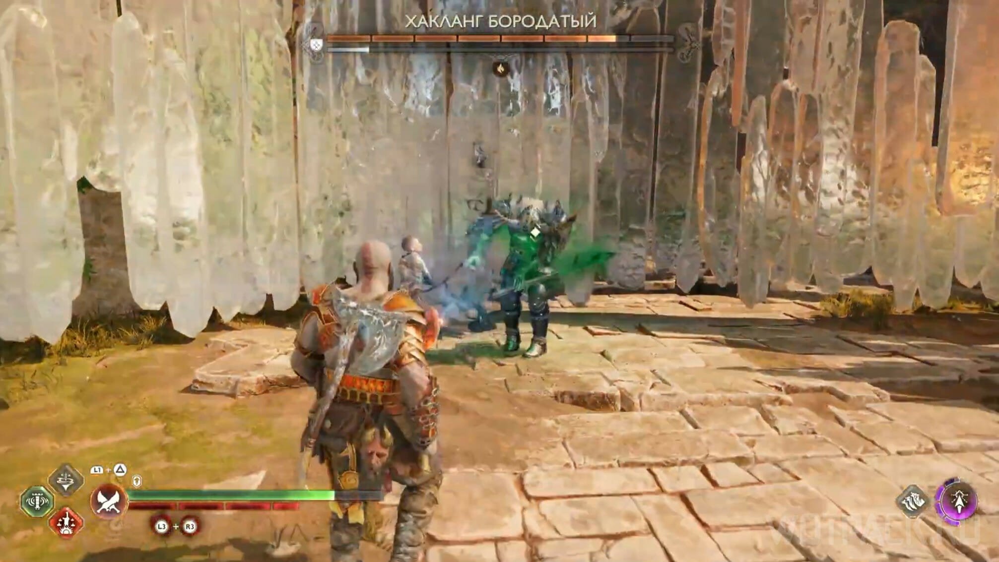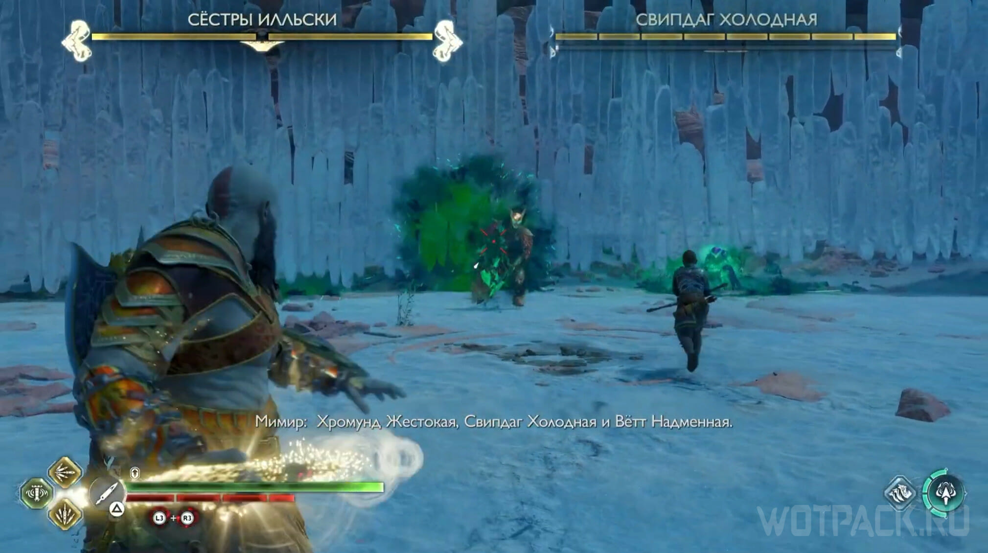 - Пока Кратос лечится, нажимайте квадрат, чтобы попросить компаньона атаковать противника и оттянуть его следующий удар.