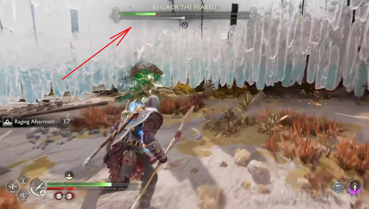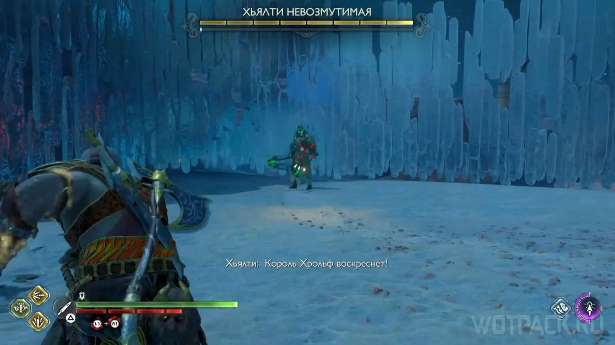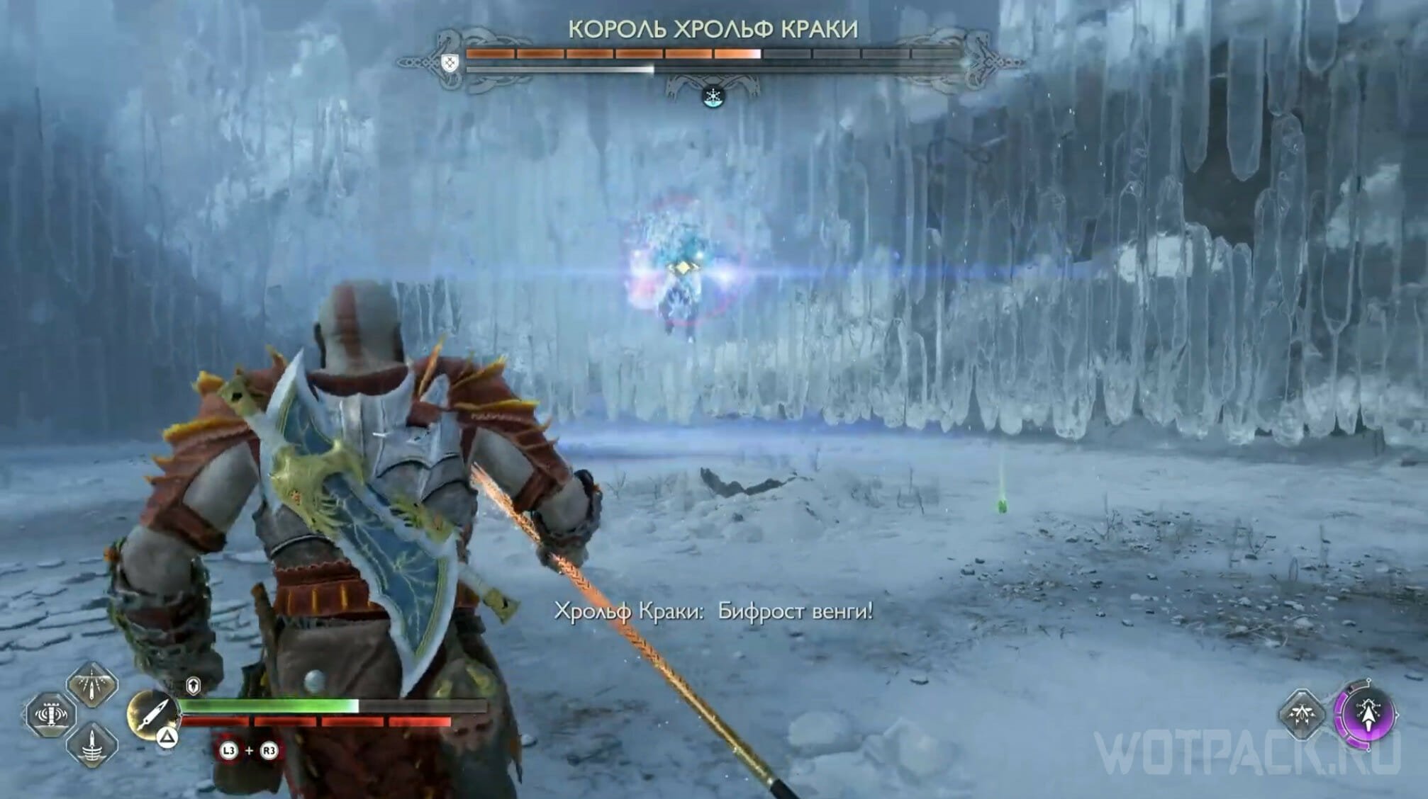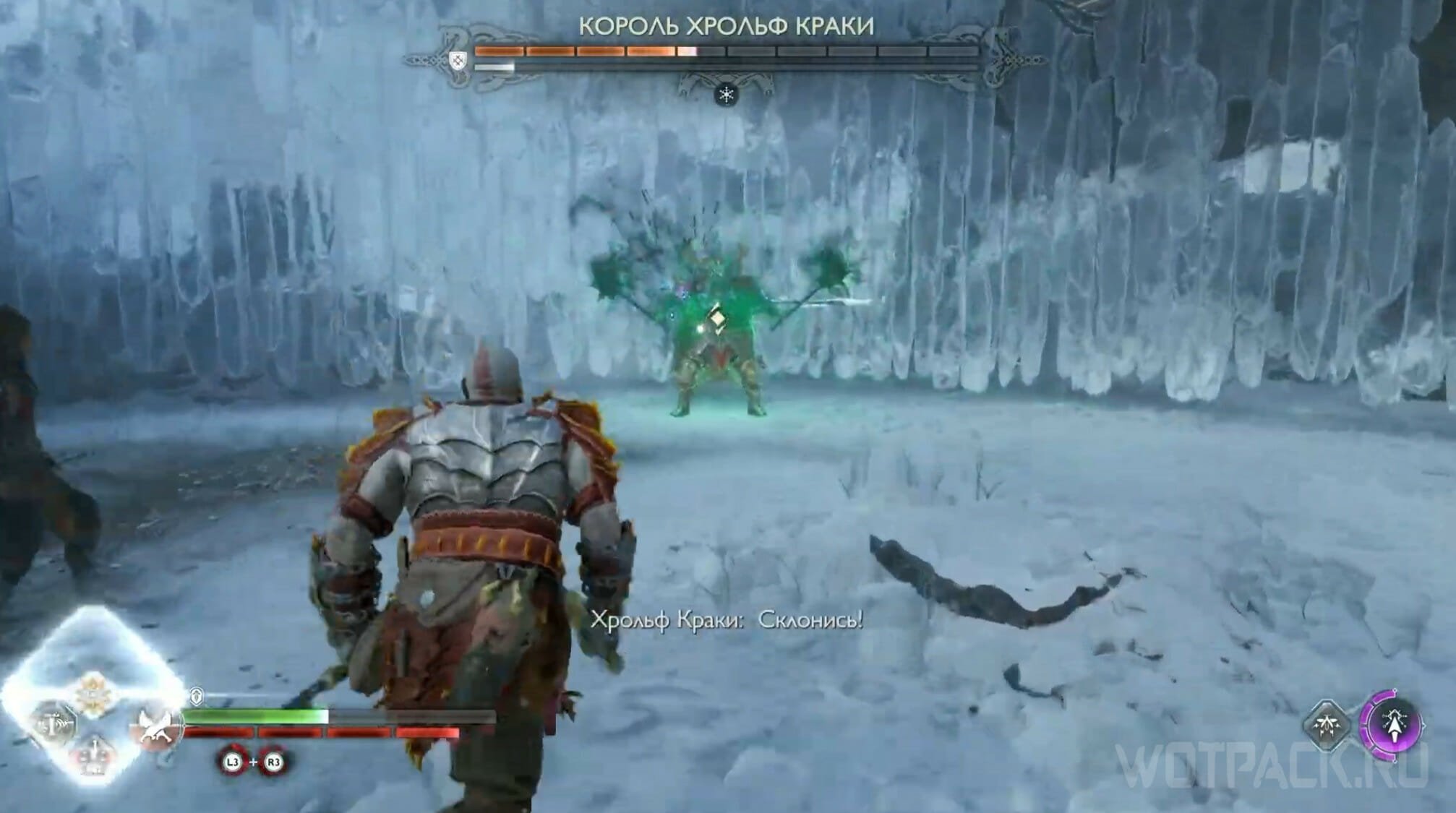 Если не отдаляться от босса, он или будет совершать обычные удары секирой, либо размашистую атаку оружием и обычные удары. Иногда берсерк накапливает мощь и со всей силы, замахнувшись сверху, вонзает оружие в лед. Если происходит неблокируемая атака, воспользуйтесь спартанской яростью, чтобы сбить ее.