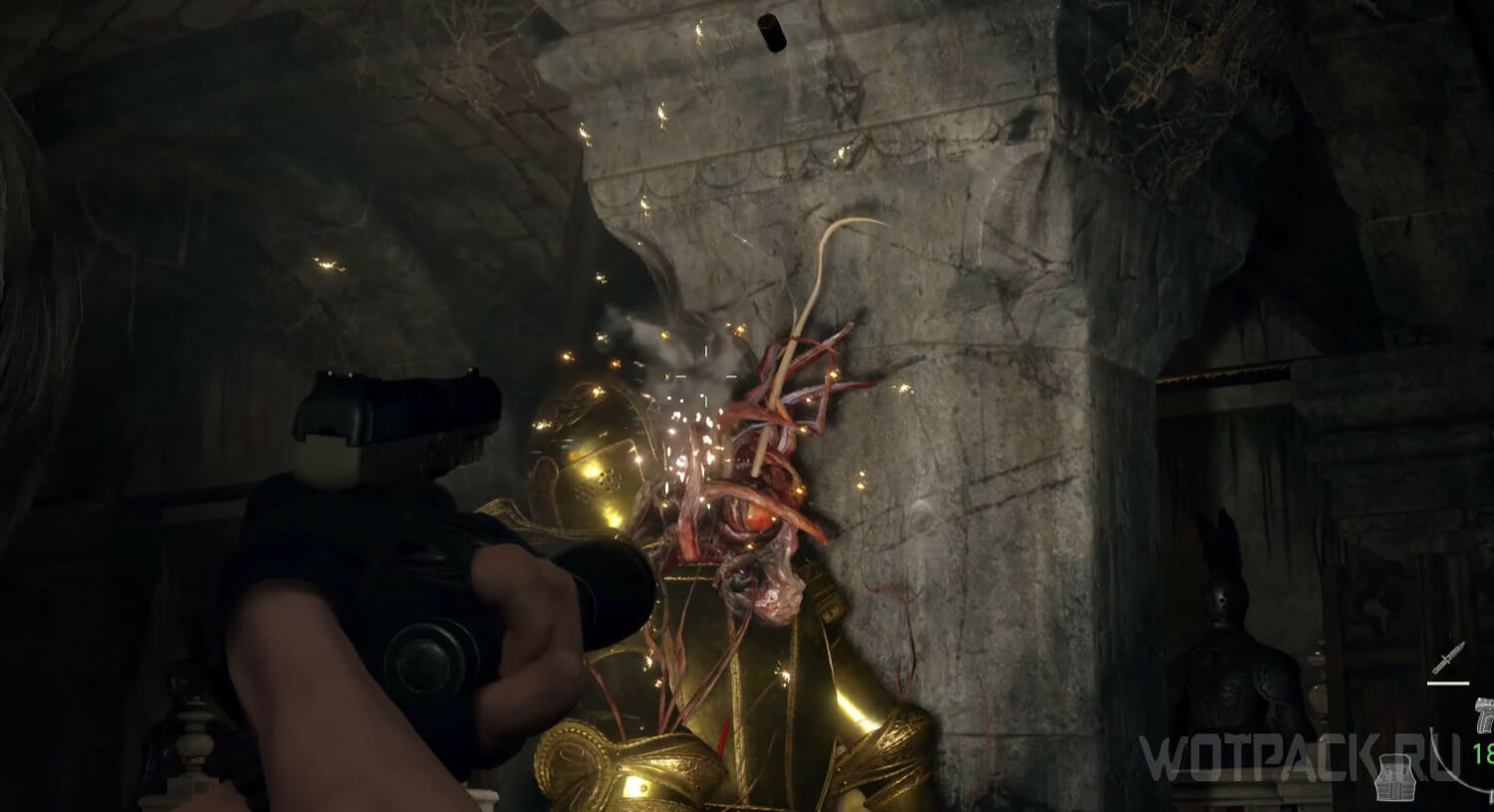 Вскоре головной убор спадет, а из места, где раньше была шея, вылезет паразит. Необходимо стрелять именно по нему, чтобы убить рыцаря. Если обнаружили, что «черви» выбрались наружу, значит противник почти мертв. Победив врагов, обыщите место сражения: найдете желтый алмаз, упавший с золотого рыцаря, а также пару самоцветов, которые дропаются с обыкновенных врагов.