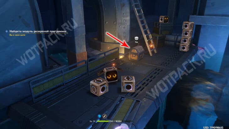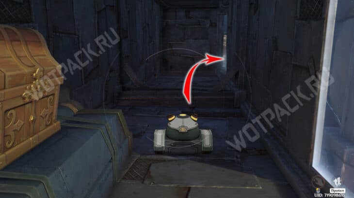 Доедьте до энергетического поля и разблокируйте его с помощью ключа с обратной стороны, после чего оставьте механизм у треснувшей стенки. Выйдя из режима управления андроидом, подойдите с внешней стороны к поврежденной части блока. Разрушьте ее силой Куувяки и зайдите внутрь открыть сокровищницу.