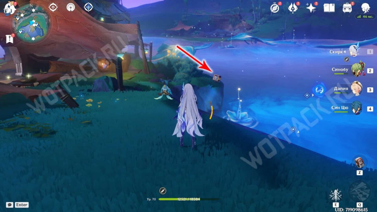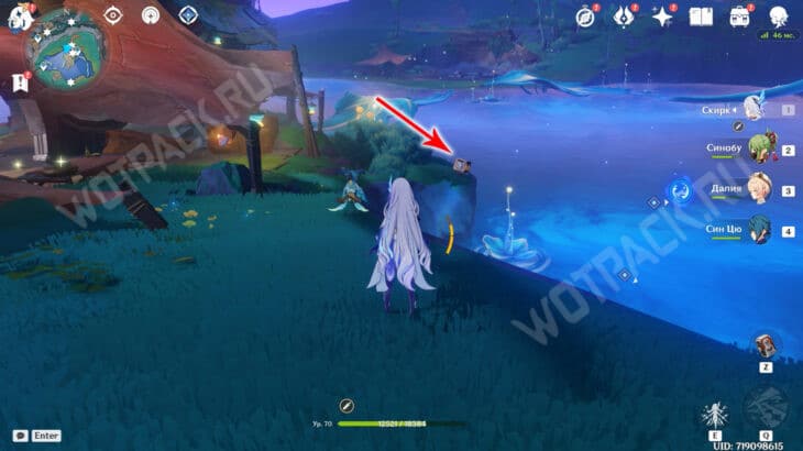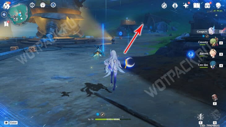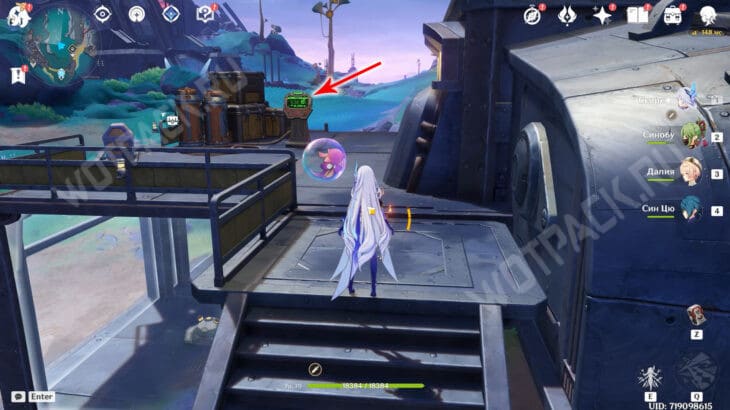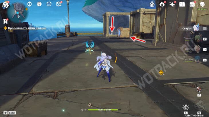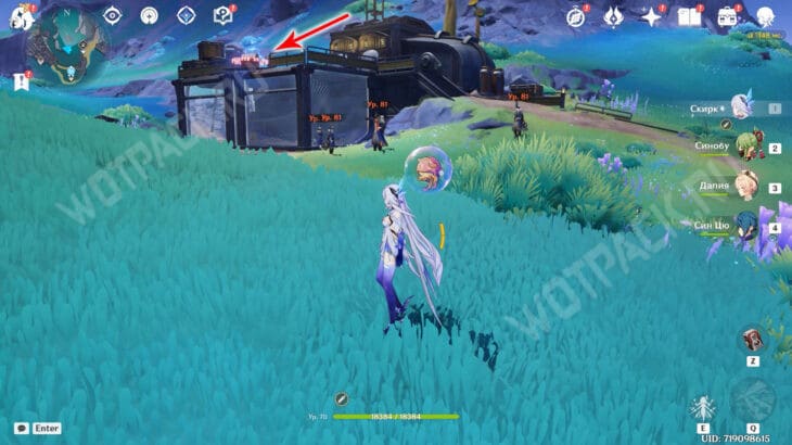 На севере от статуи Богини Луны находится полевое укрытие Фатуи. Разберитесь с пешим отрядом противников и поднимитесь на второй этаж постройки.