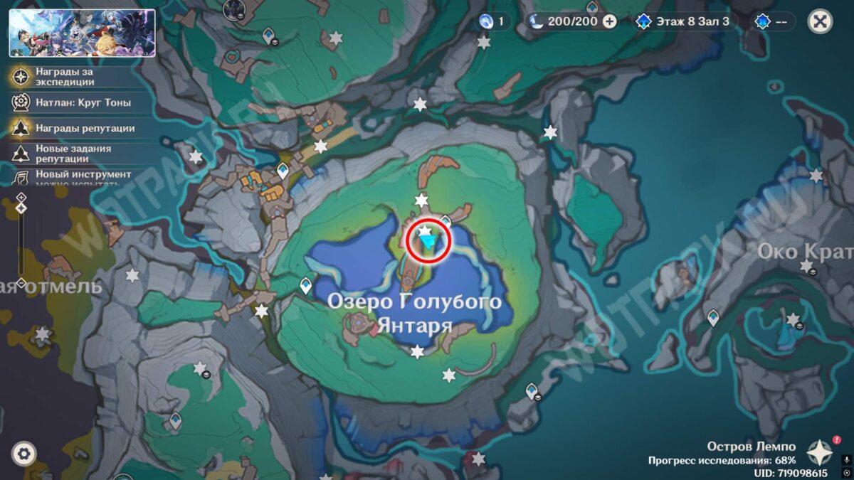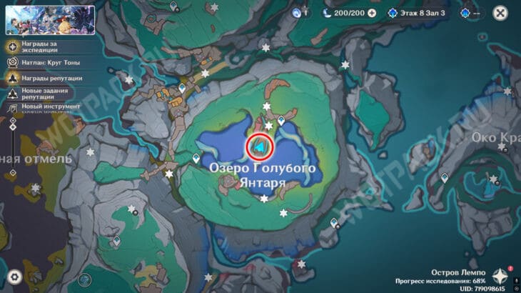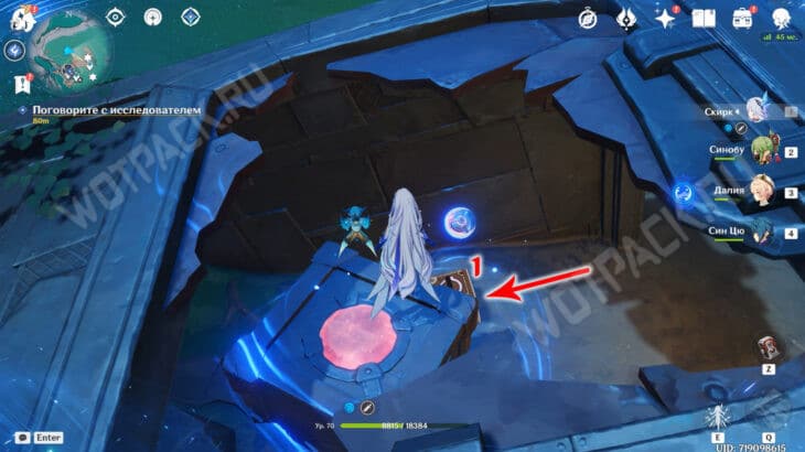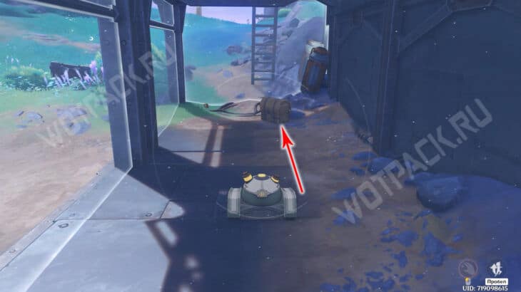 Войдите в полевую лабораторию Фатуи и спуститесь к плите у синих горных пиков в водоеме.
