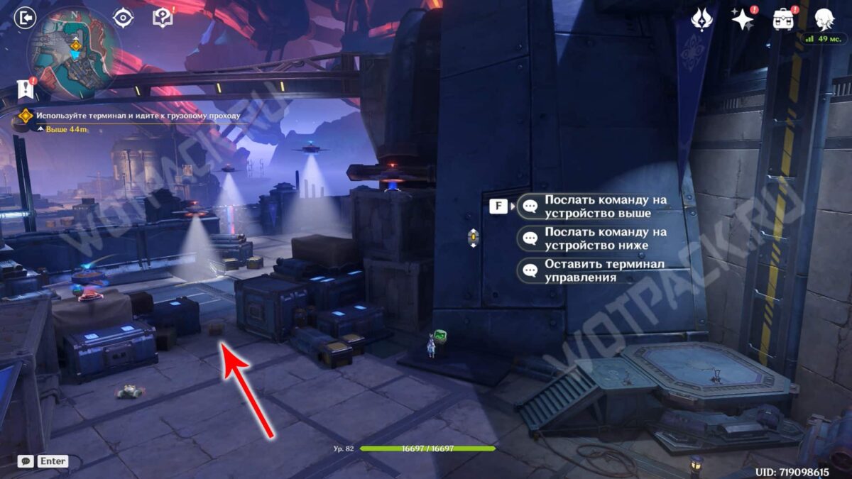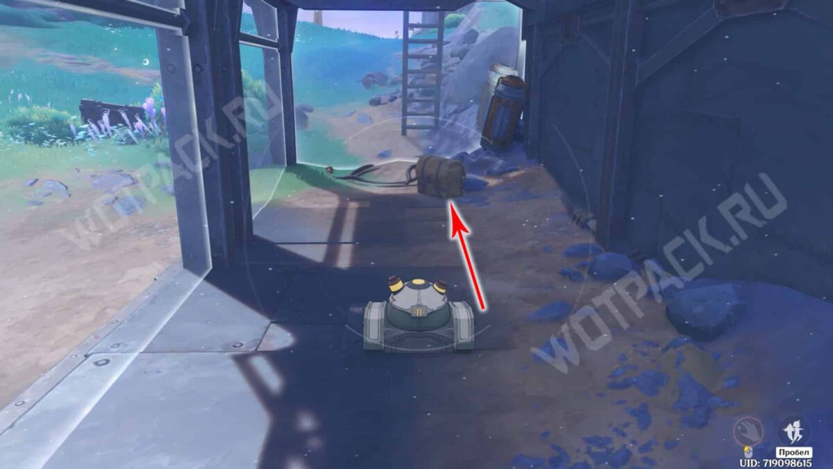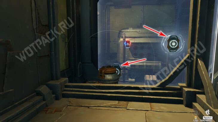 Загляните за левую сторону контейнера и направьте удар в стоящий рядом гаджет. Последнее творение скрылось за лунными растениями у камня — повторите те же действия, что и с предыдущими. Когда все механизмы соберутся на платформе, нажмите «Закрыть» и заберите сундук на крыше блока.