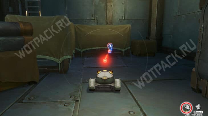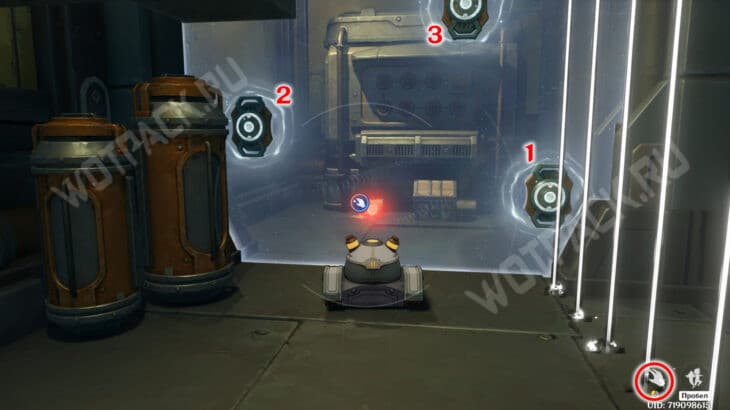 - в седьмой точке бросьте ретранслятор, чтобы оттолкнуть андроида от красного блока и запустить его в разведчика.