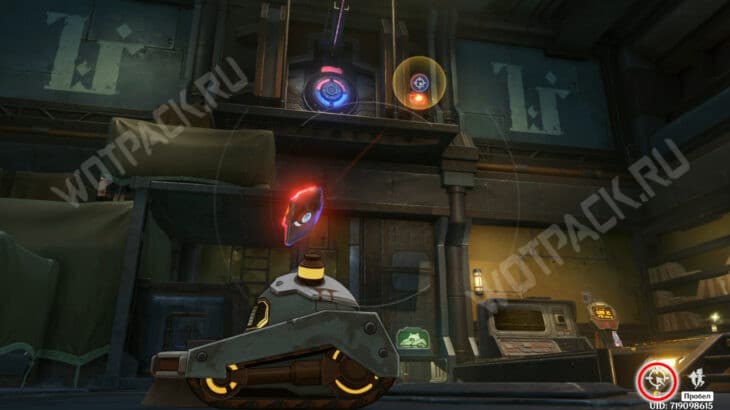 Разрушьте крышу железного укрытия, кинув излучающий энергию объект в красный куб. Затем заберите устройство и встаньте на блок. Дождитесь появления синего поля, через несколько секунд в это место попадет разряд молнии и активирует бота.