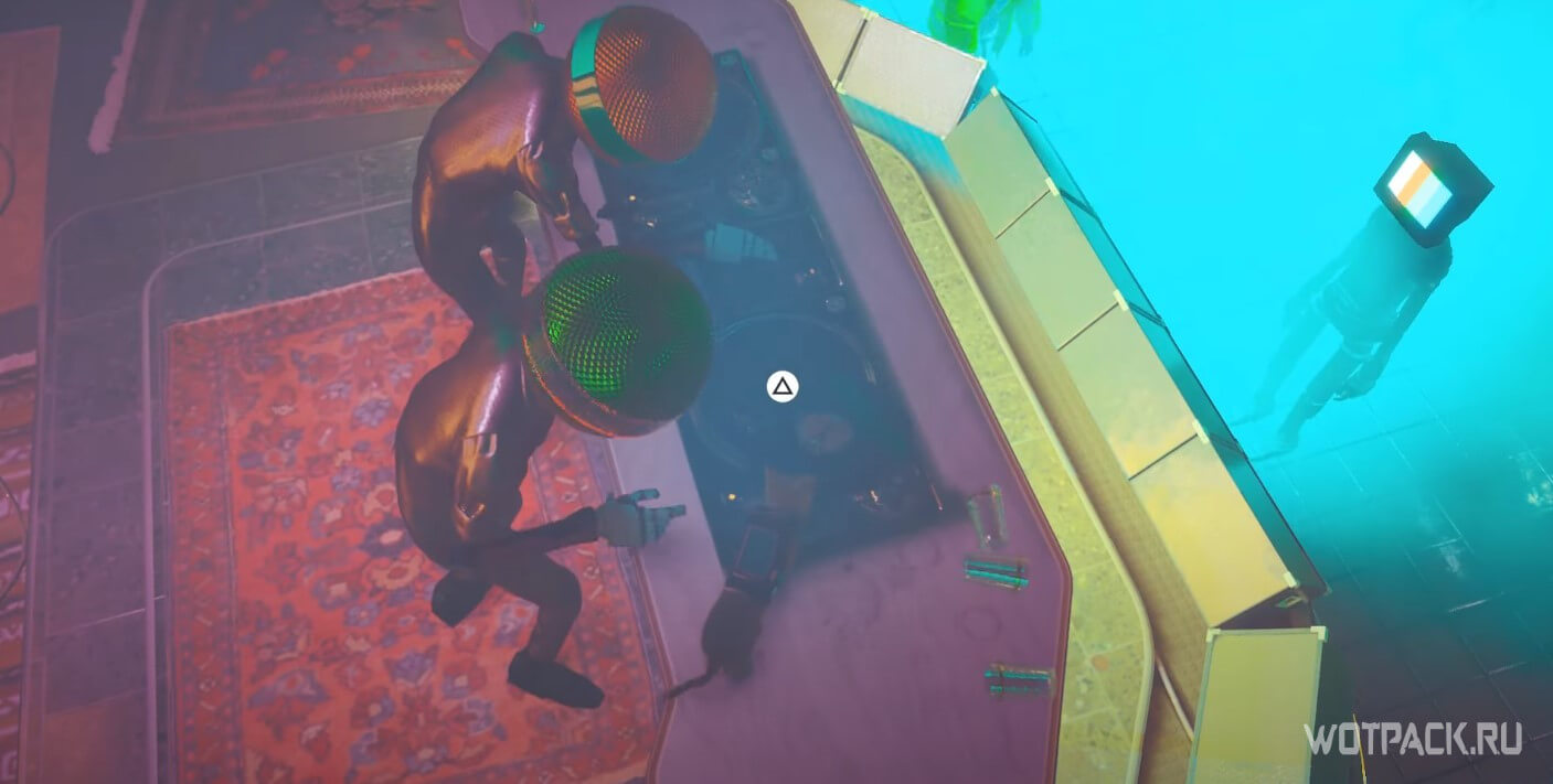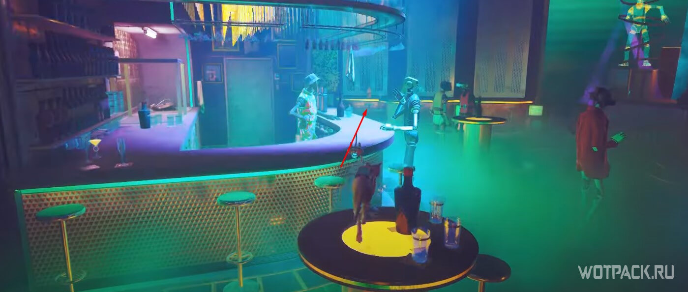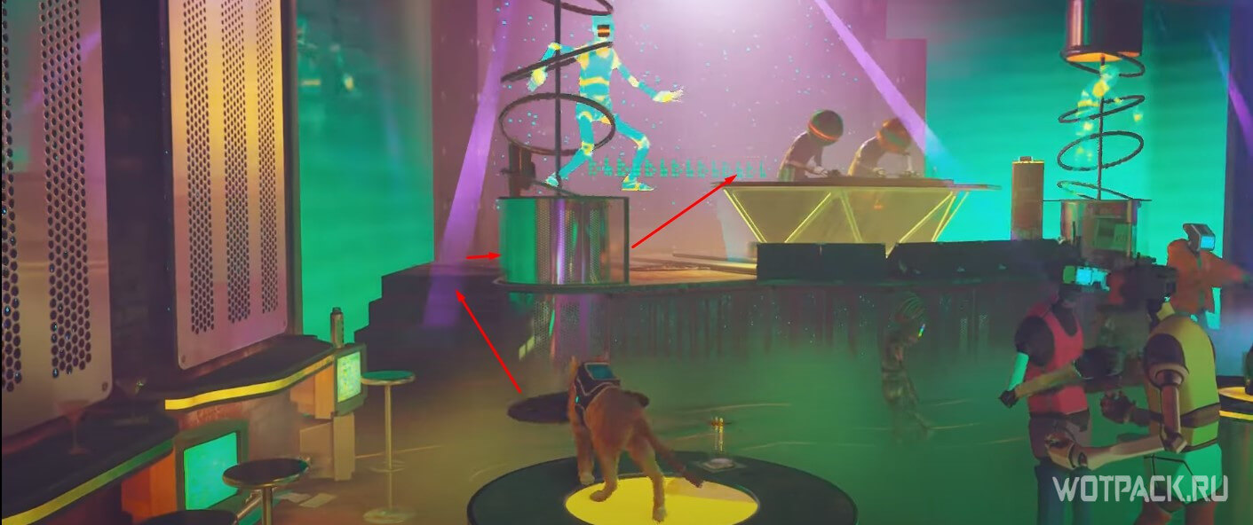Робот предложит зайти отдохнуть: запрыгните в окно, а затем поверните налево. Возле барной стойки стоит стол, на котором лежит нужная пластинка. Возьмите ее в зубы и направляйтесь к диджейской стойке. Поставьте винил на проигрыватель, а после взаимодействуйте с ним.