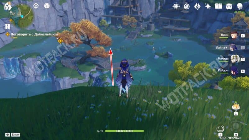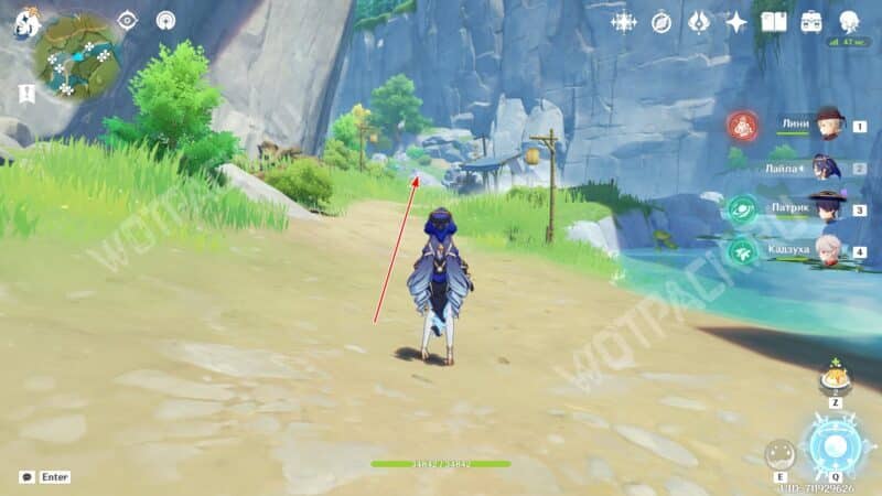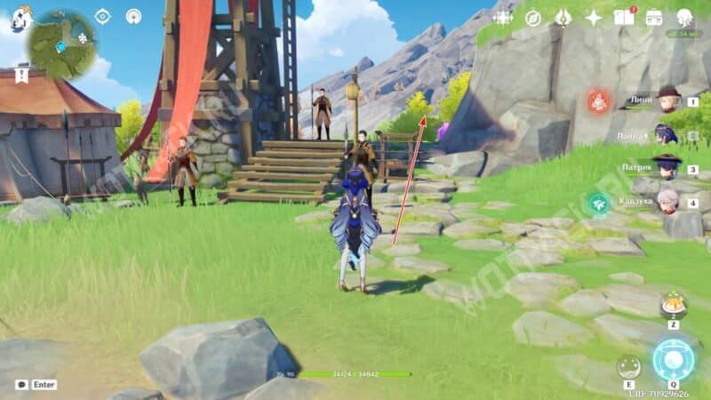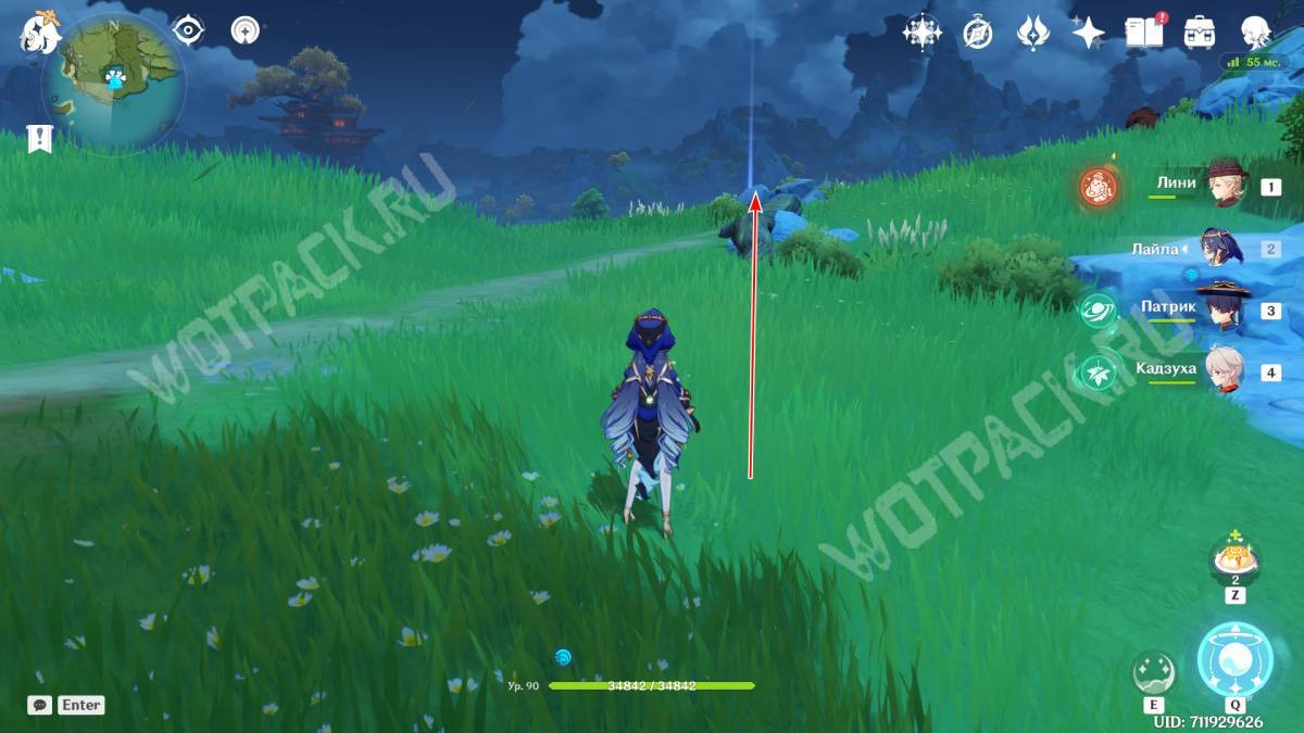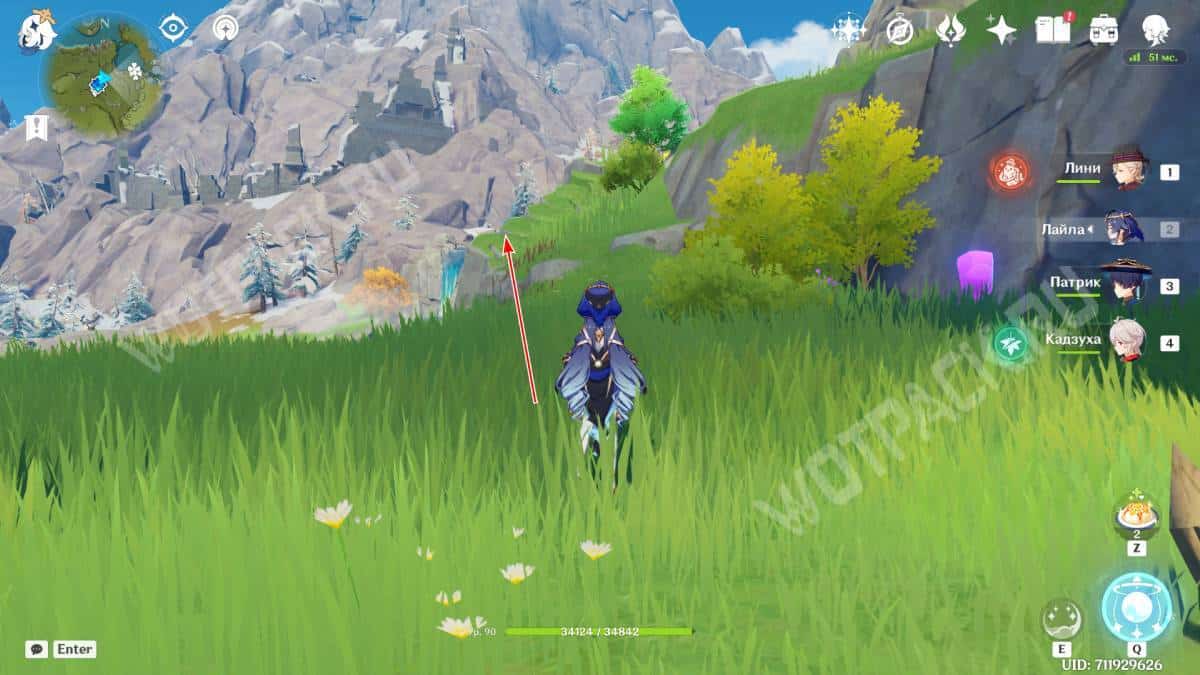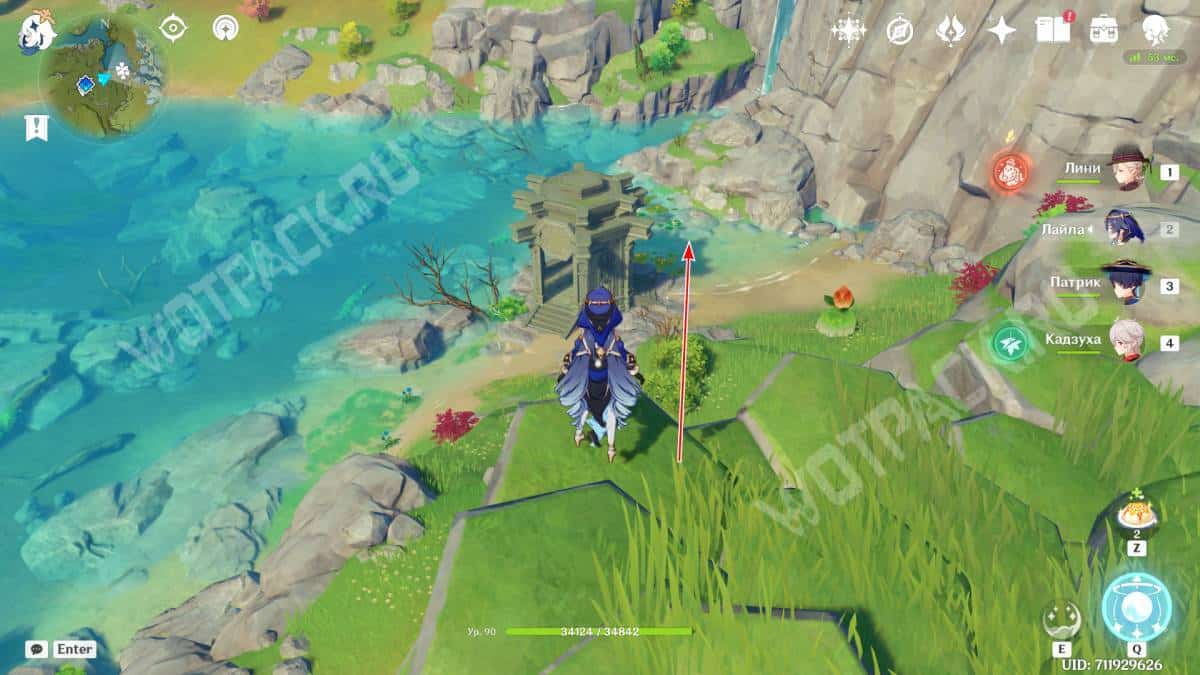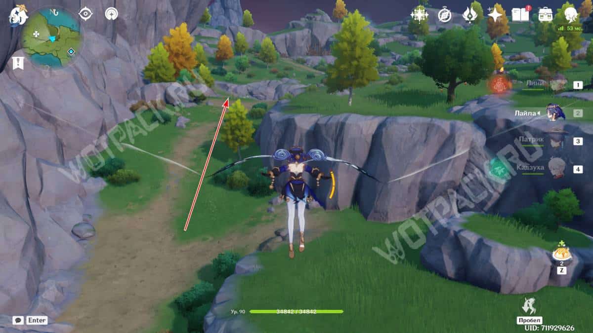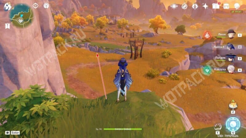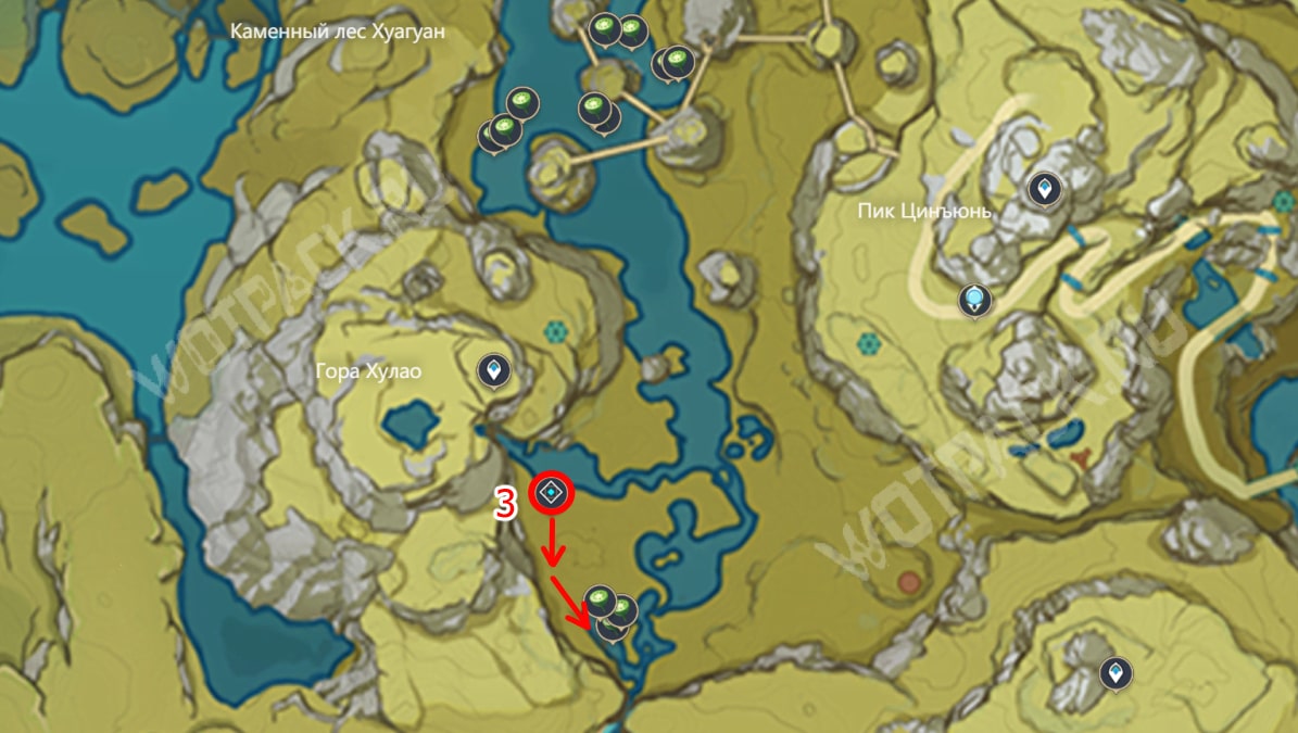 Потом телепортируйтесь на «Постоялый двор Ваншу» и летите на юго-запад от него. От старых руин идите вперед, к вышке хиличурлов.