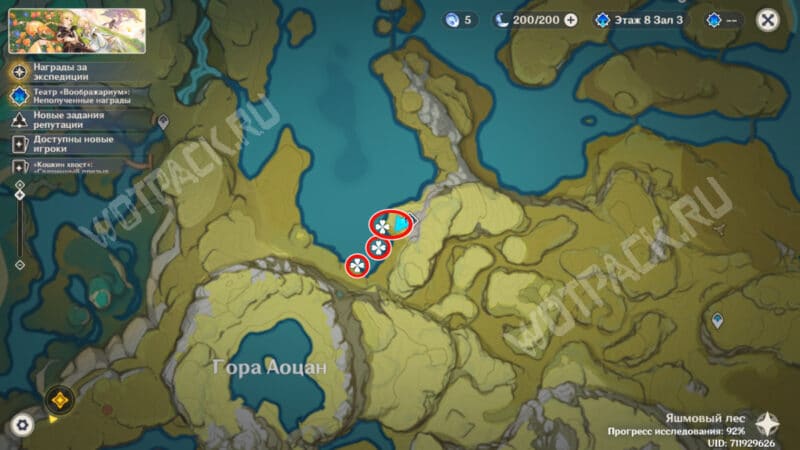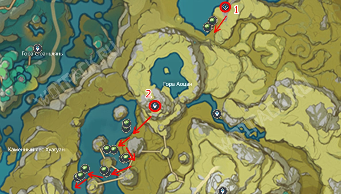 Потом телепортируйтесь к точке «Гора Аоцан» и спуститесь вниз, к берегу озера. Там вы увидите пару растений.