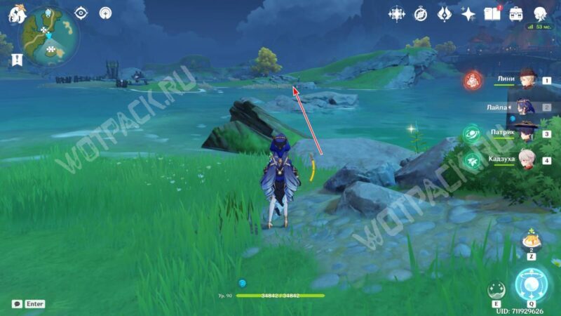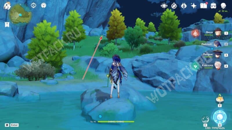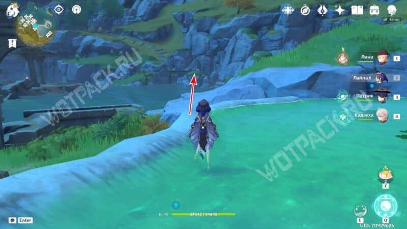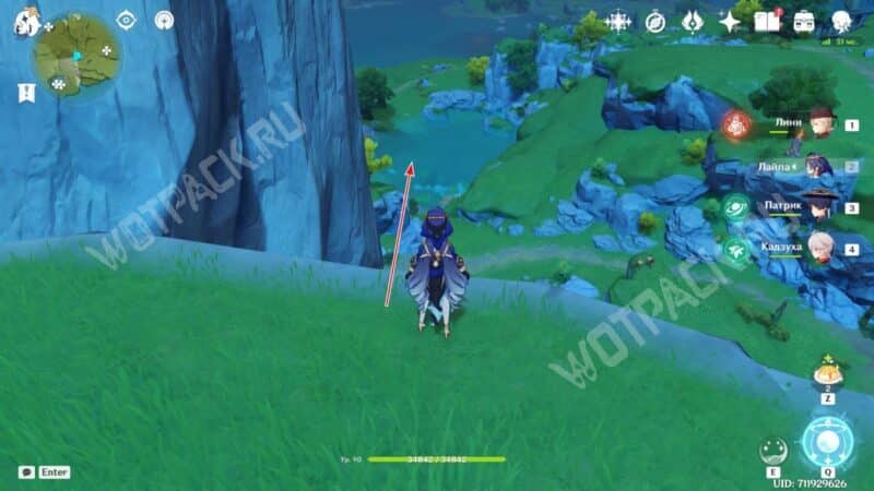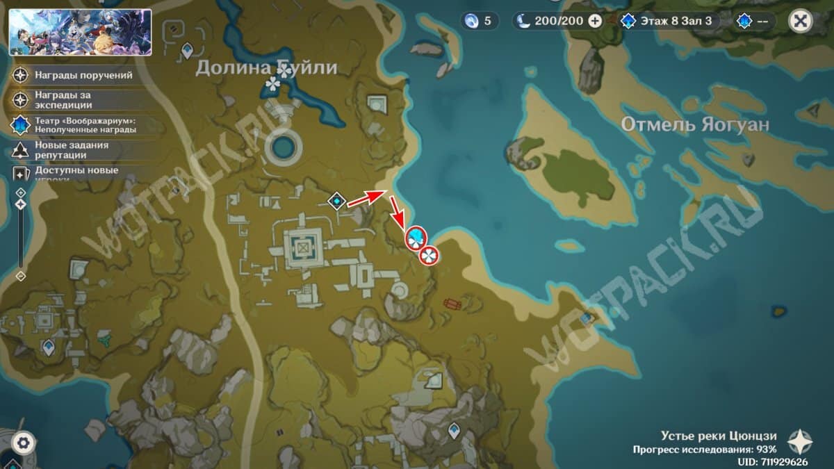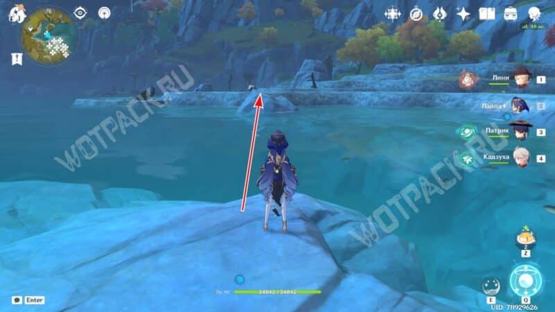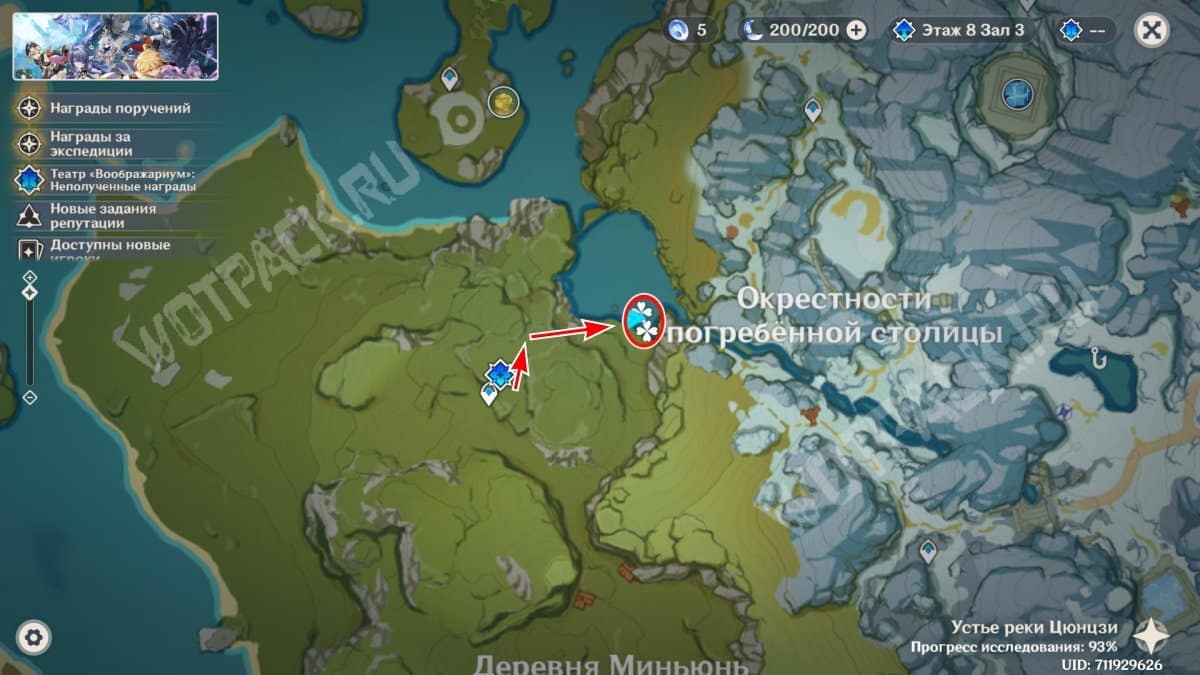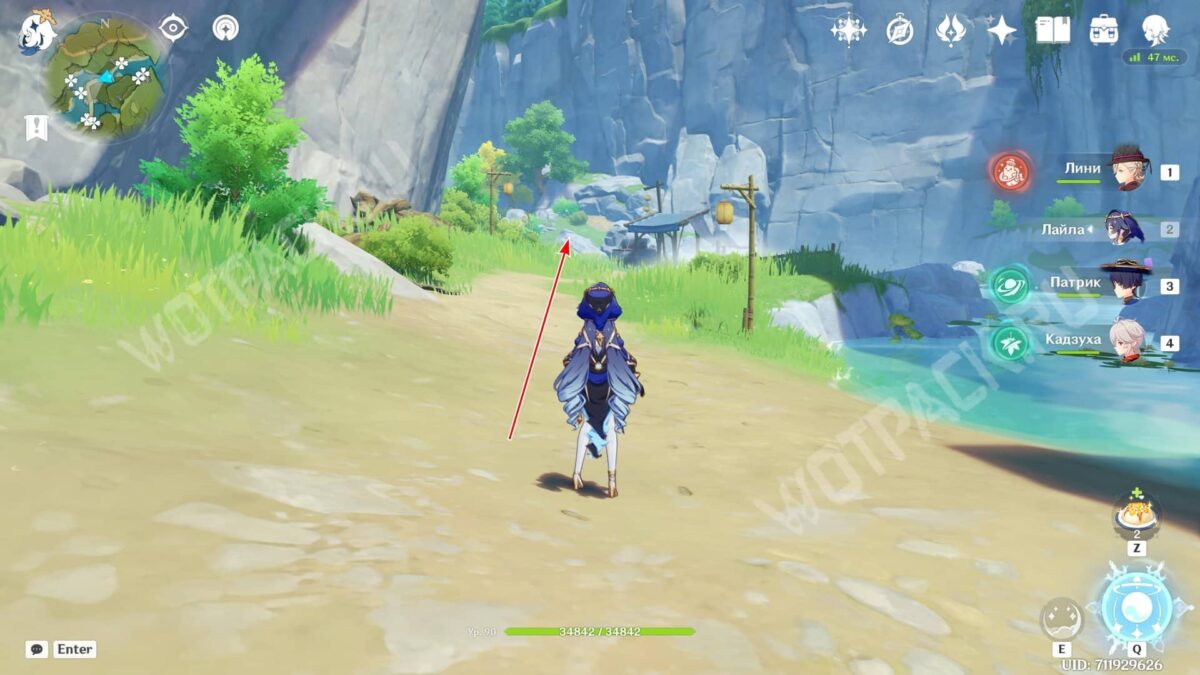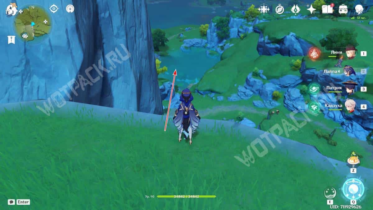 Переместитесь к «Устью реки Цюнцзи» или к «Мрачному натиску» — точки телепортации расположены рядом. Пройдите мимо миллелитов, обогните камень справа и идите вперед, к обрыву.